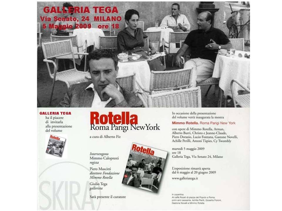In occasione dell’uscita, nei tipi di Skira, dell’importante volume Mimmo Rotella Roma Parigi New York a cura di Alberto Fiz, ideato da Piero Mascitti e realizzato con la collaborazione della Fondazione Mimmo Rotella e della galleria Tega, lo spazio milanese presenta, dal 6 maggio al 20 giugno 2009, una mostra che pone in relazione l’indagine di Mimmo Rotella con quella di artisti con cui ha condiviso importanti esperienze linguistiche come Arman, Alberto Burri, Christo e Jeanne-Claude, Piero Dorazio, Lucio Fontana, Gastone Novelli, Achille Perilli, Antoni Tàpies e Cy Twombly.