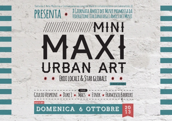 In occasione della X Giornata Amici dei Musei promossa da FIDAM (Federazione Italiana degli Amici dei Musei), domenica 6 ottobre 2013 dalle 16.00 alle 19.00 la Galleria d’Arte Moderna e Contemporanea Lorenzo Viani presenta, in collaborazione con Laboratorio 21, MINI MAXI URBAN ART a cura di Gaia Querci, un incontro con esperienze di arte urbana locale e internazionale che si propone di sensibilizzare il pubblico alle nuove tendenze dell'arte contemporanea utilizzando la strada come ribalta aperta e condivisa per esprimersi su tematiche di rilevanza sociale e dare libero sfogo a visioni fantastiche e invenzioni poetiche.