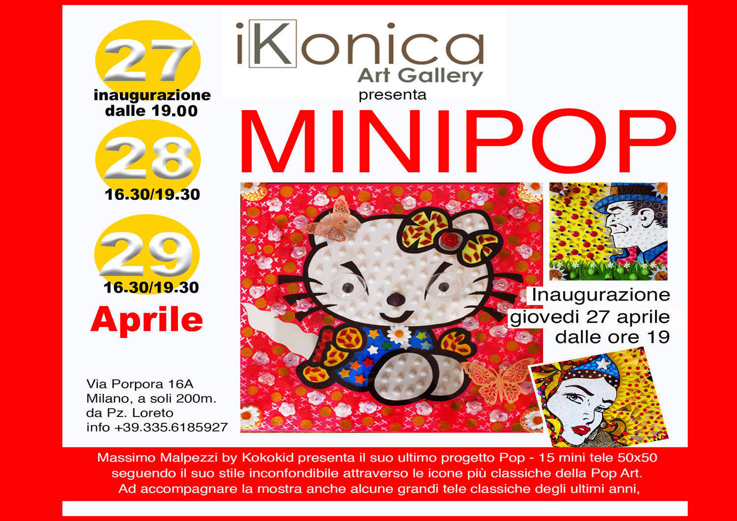 Massimo Malpezzi by Kokokid presenta il suo ultimo progetto POP 15 tele cm 50×50 seguendo il suo inconfondibile stile attraverso le icone più classiche della Pop Art. Ad accompagnare le 15 nuove tele anche alcune di più grande formato degli ultimi anni.