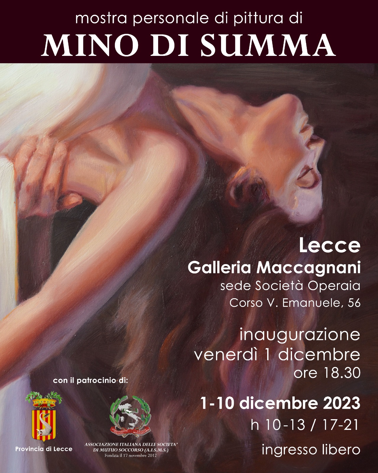 Verrà inaugurata venerdì 1 dicembre, alle ore 18.30, presso la Galleria E. Maccagnani, sede della Società Operaia di Lecce in Corso V. Emanuele n. 56, la mostra personale di Mino di Summa, artista originario di Francavilla Fontana, noto a livello internazionale.