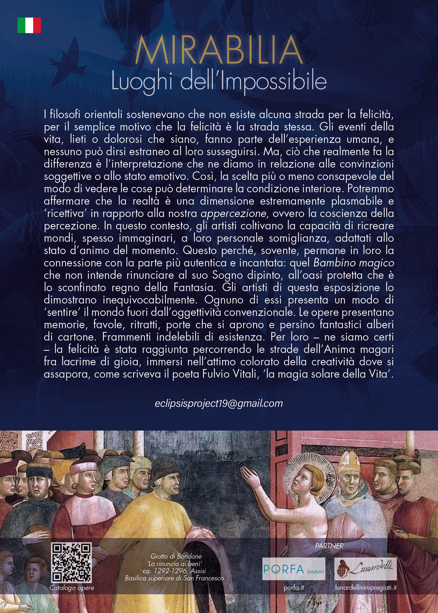 C’è un luogo dove l’Impossibile prende forma, dove il sogno si fa colore, dove la realtà si piega all’immaginazione: MIRABILIA arriva ad Assisi. Con la partecipazione di 9 artisti italiani di spicco. Un’esposizione dove realtà e sogno si fondono in un viaggio artistico unico.