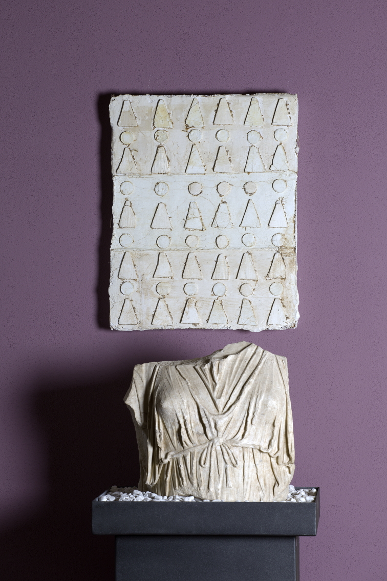 Le opere pittoriche presentate in mostra sono caratterizzate dalla ricerca di materiali nuovi quali gesso, cemento, malta, terracotta, ceramica, legno, stoffa, carta, con varie tipologie di colori naturali.
