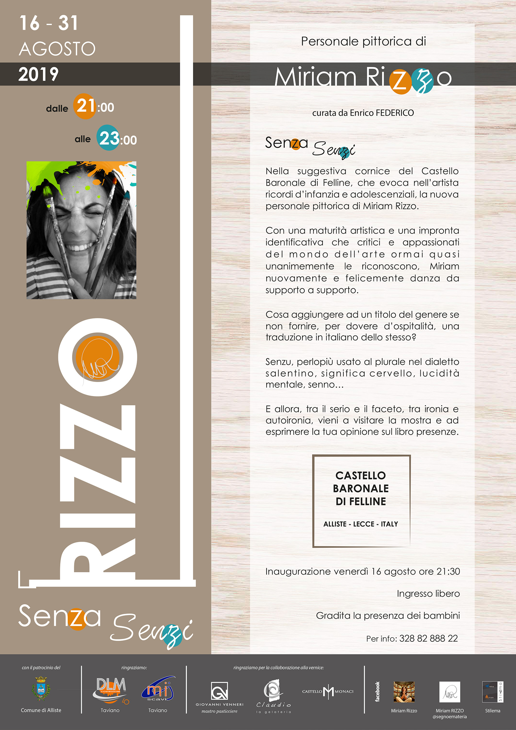 Miriam Rizzo è pittrice e grafica salentina. Nata a Gallipoli si è diplomata all’Accademia di Belle Arti di Lecce nel 1998 ed è titolare, dal 2001, di un piccolo studio di grafica, pubblicità e design in Taviano a pochi chilometri da Lecce.