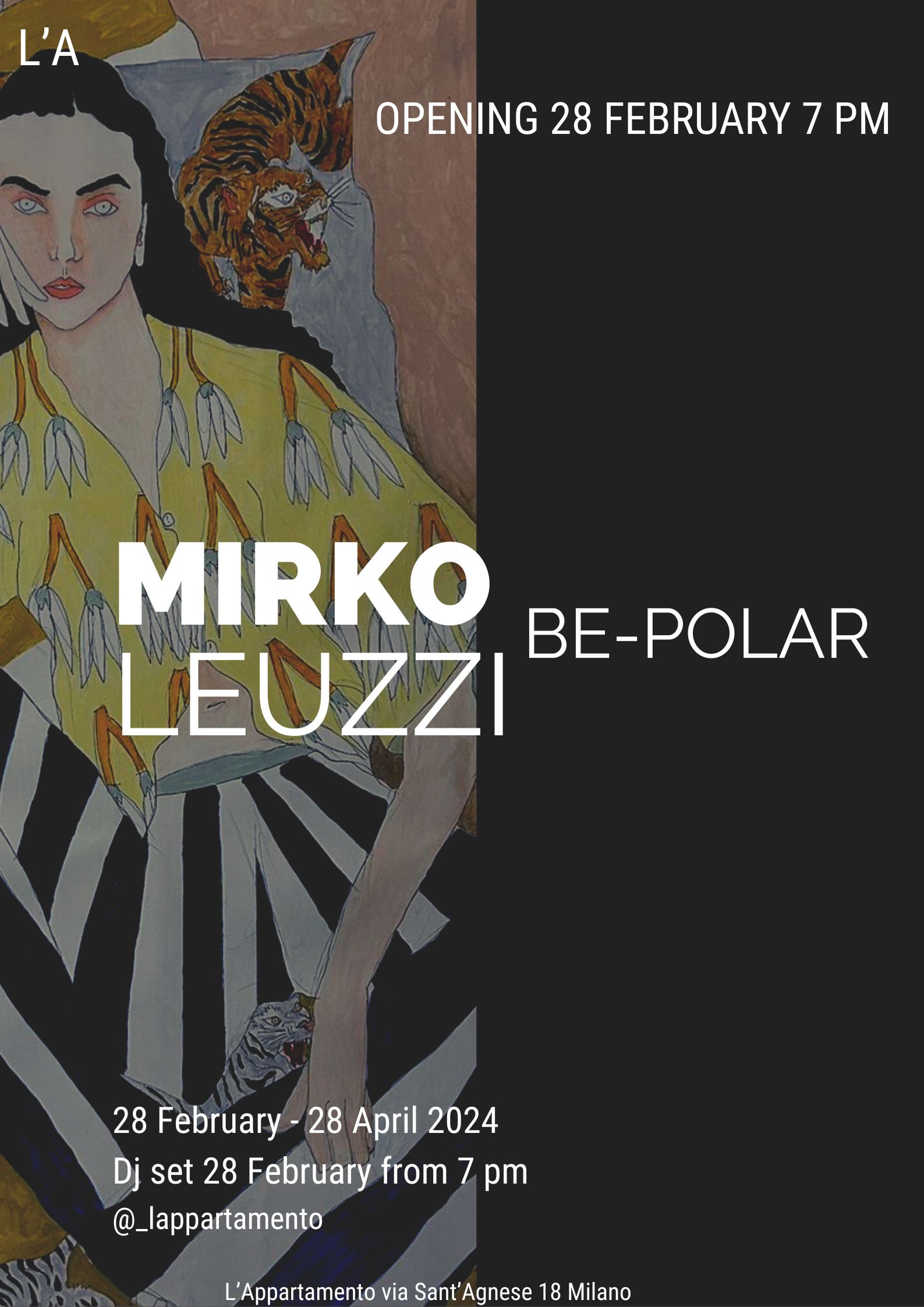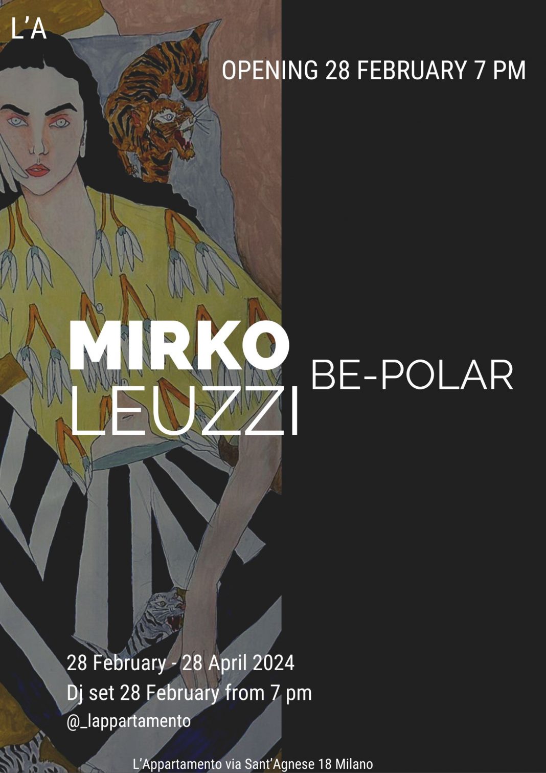 L’appartamento presenta BE-POLAR, un dialogo tra le opere su tela e i disegni su carta in forma di fumetto di Mirko Leuzzi, artista romano dalla personalità anti convenzionale e provocatoria, per la prima volta a Milano.