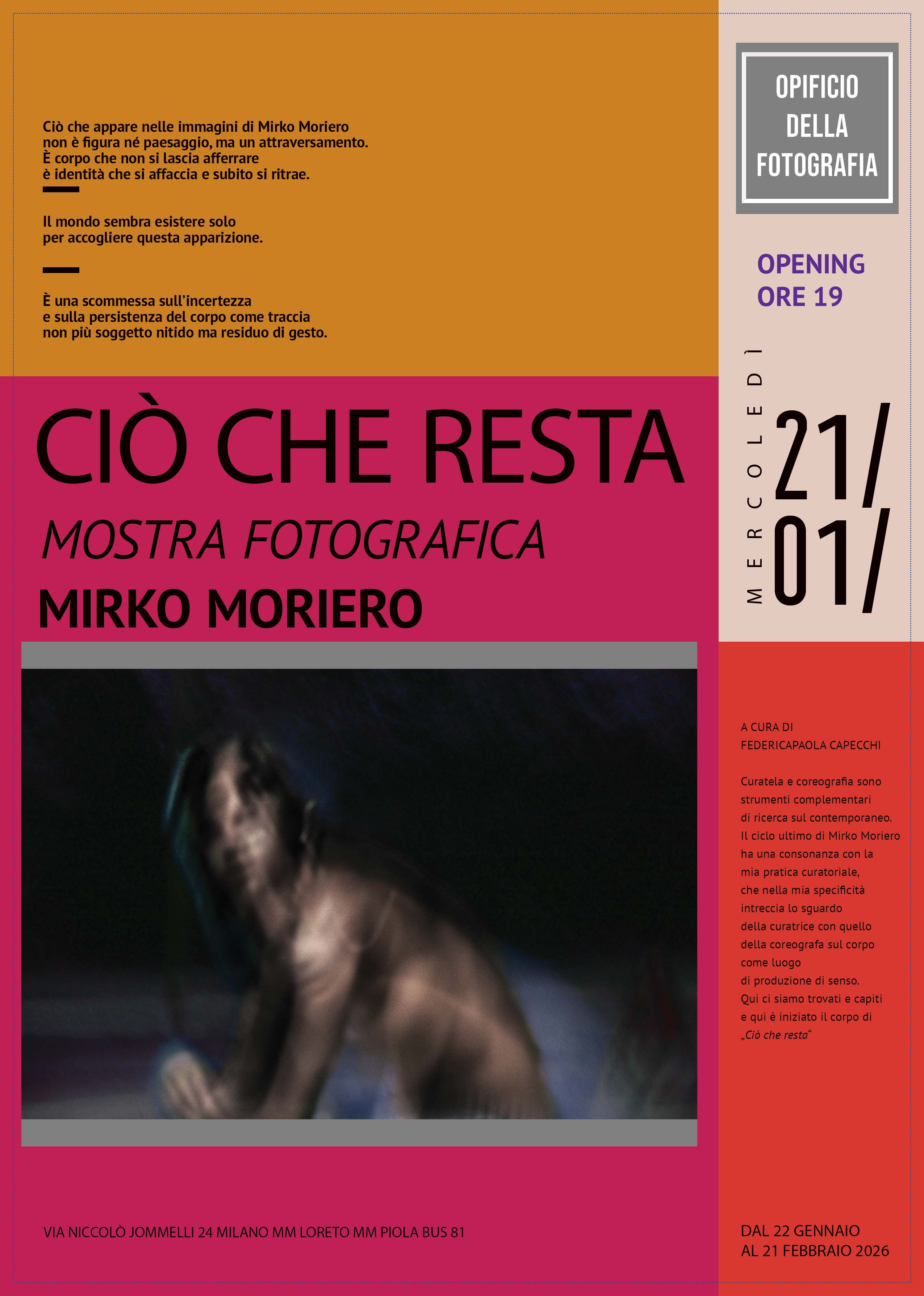 Opificio della Fotografia presenta "Ciò che resta", mostra personale del fotografo Mirko Moriero, un progetto ideato e curato da Federicapaola Capecchi che esplora il confine sottile tra presenza e assenza, tra corpo e spazio, tra apparizione e dissolvenza.