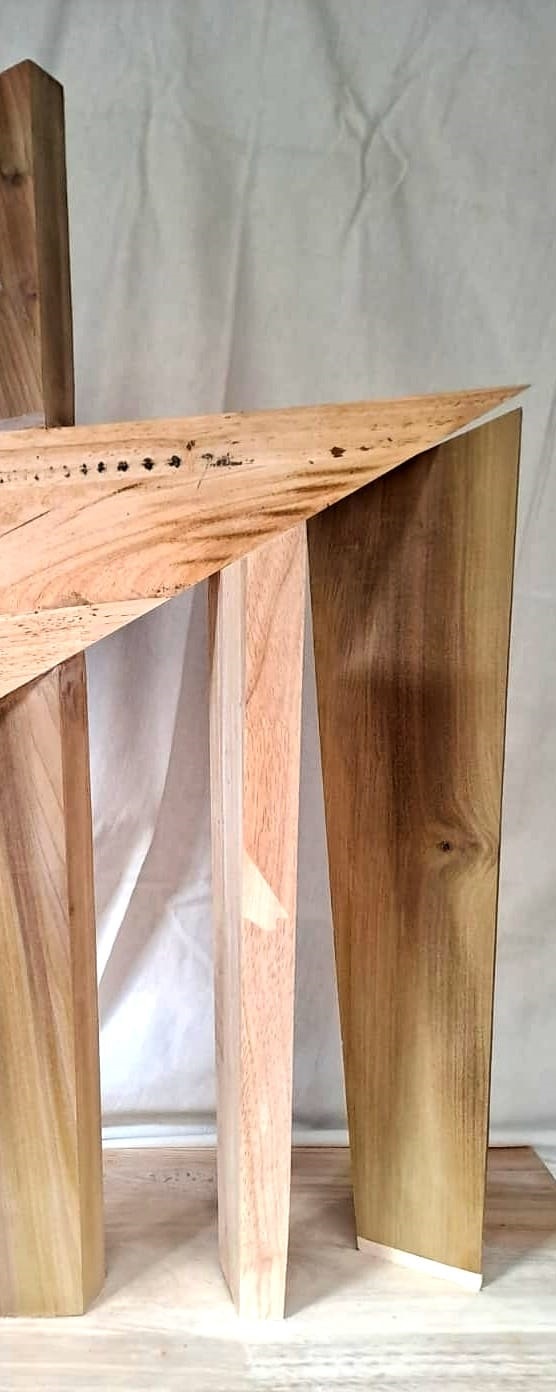 Trait d’union con questa esposizione a TRAleVOLTE è la maquette in legno di Fucinafuoco, presentata in mostra come un testimone, a continuazione di un discorso che dall’aperto di un parco si sposta al chiuso di un luogo storico. Perché qui la trasformazione che si attua è di tipo concettuale. La scultura si stacca da terra, libra nell’aria sino a rendersi ombra, muta dal ferro alla carta, alla luce, in un’opera totale che abbraccia lo spazio chiuso e lo spettatore che la attraversa. È la leggerezza della scultura, che nella chiarezza della forma geometrica del triangolo rettangolo ci conduce in un percorso verso l’immaterialità.