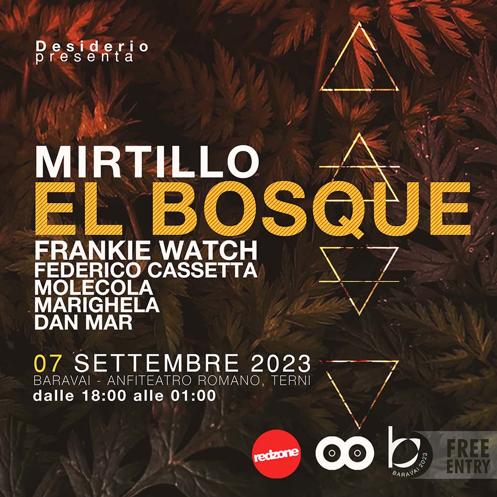 Tra i protagonisti che anticiperanno “El Bosque” sul palco dell’Anfiteatro Romano di Terni: Frankie Watch, Federico Cassetta, molecola, MariGhela e Dan Mar. Nel Live Set dedicato a “El bosque” Mirtillo (Desiderio) sarà l’accompagnatore musicale insieme alle sue banshee e streghe, progetto performatico coordinato da Valentina Gaia Pacheco con Irene Sdogati, Silvia Pellicano, Sofia Quadrini e voce narrante di Elena Nati con il supporto visual di Nicolò Scentoni.