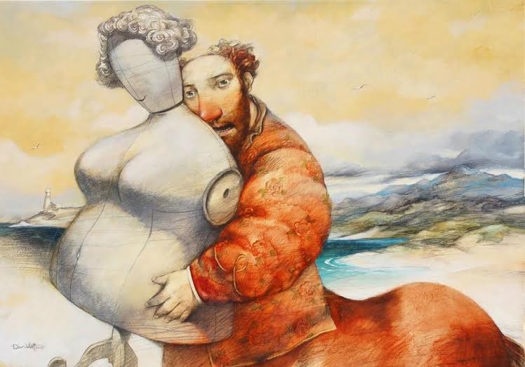 “La prima impressione, appena entrati nel magico atelier dove sono dispiegate, in bella evidenza, le opere di Alexander Daniloff – scrive nella sua presentazione il curatore Giovanni Stella - è che l’arte, per lui, sia uno stratagemma per evadere il mondo e dar vita a un antimondo onirico, surreale, creatura di un mago affabulatore, vulcanico, felliniano: un approdo per noi migranti, relitti semiseri di un mondo scomparso.