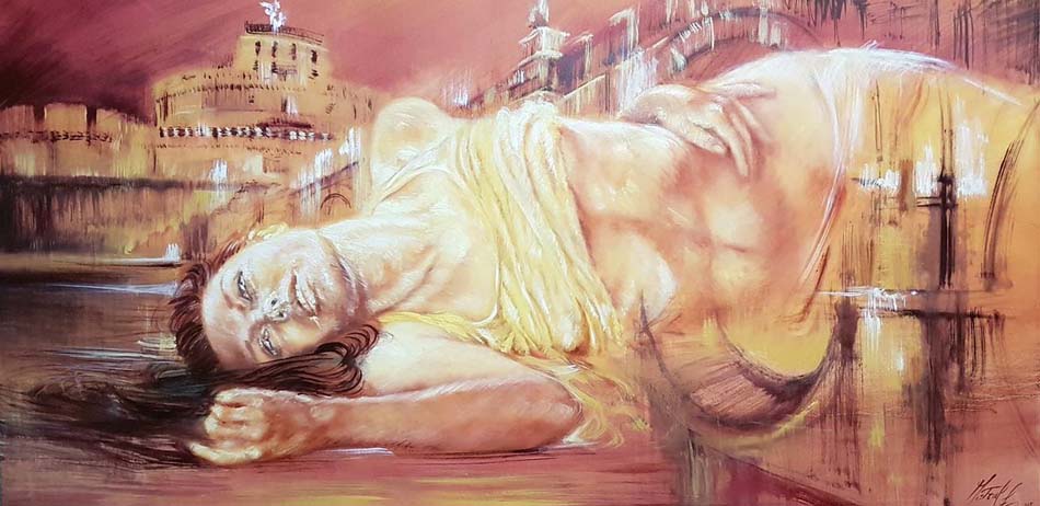 In esposizione dipinti ad olio su grandi tele che avvolgono il fruitore nel connubio tra la donna e Roma, ‘protagoniste incontrastate del mondo ’, con scorci della antica città in contesti contemporanei.