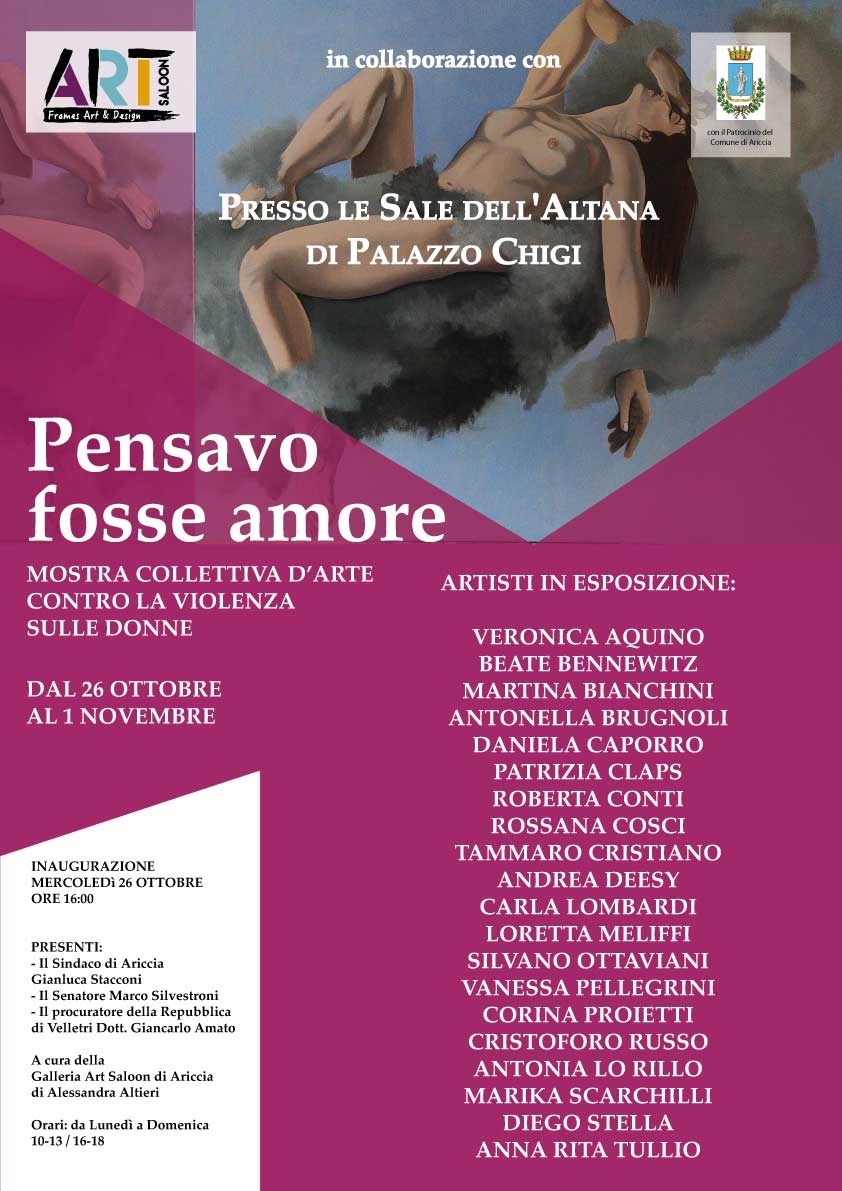 A partire dal 3 Novembre le opere della Mostra “Pensavo fosse Amore” verranno spostate presso la Galleria Art Saloon di Ariccia e resteranno in permanenza fino al 12 Novembre.