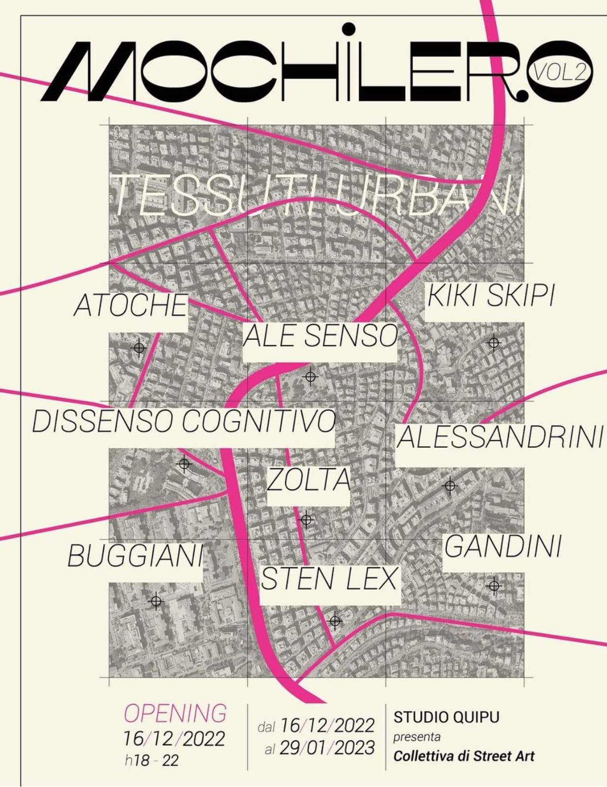 Studio Quipu, in occasione della mostra collettiva Mochilero Vol. 2 / tessuti urbani, presenta una selezione di opere di protagonistə della street art italiana.