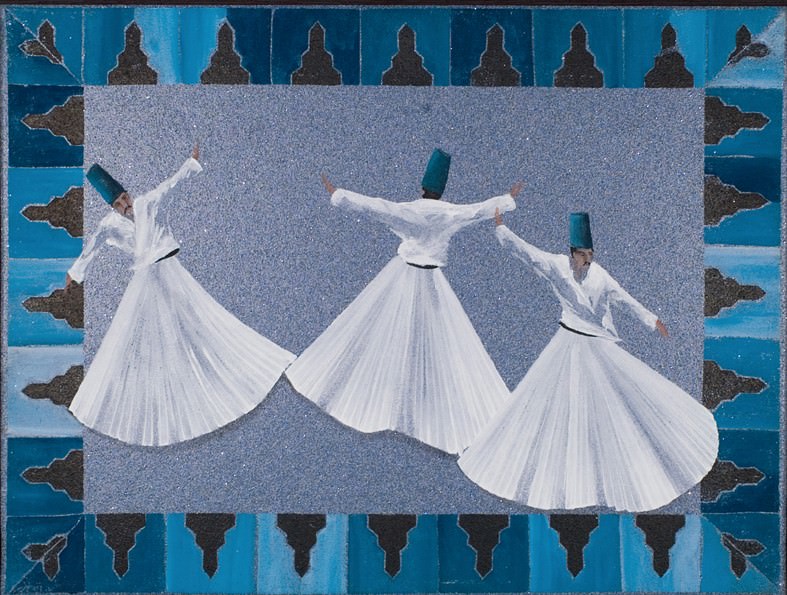 Ma letteralmente indimenticabili restano per il grande pubblico per i suoi dervisci danzanti, una tra le immagini più significative di questo nostro mondo multietnico e interrazziale , rese da Aldo Mondino in un ciclo di dipinti di alto valore poetico, con ideale sottofondo musicale le bellissime canzoni di Franco Battiato degli anni ’80.