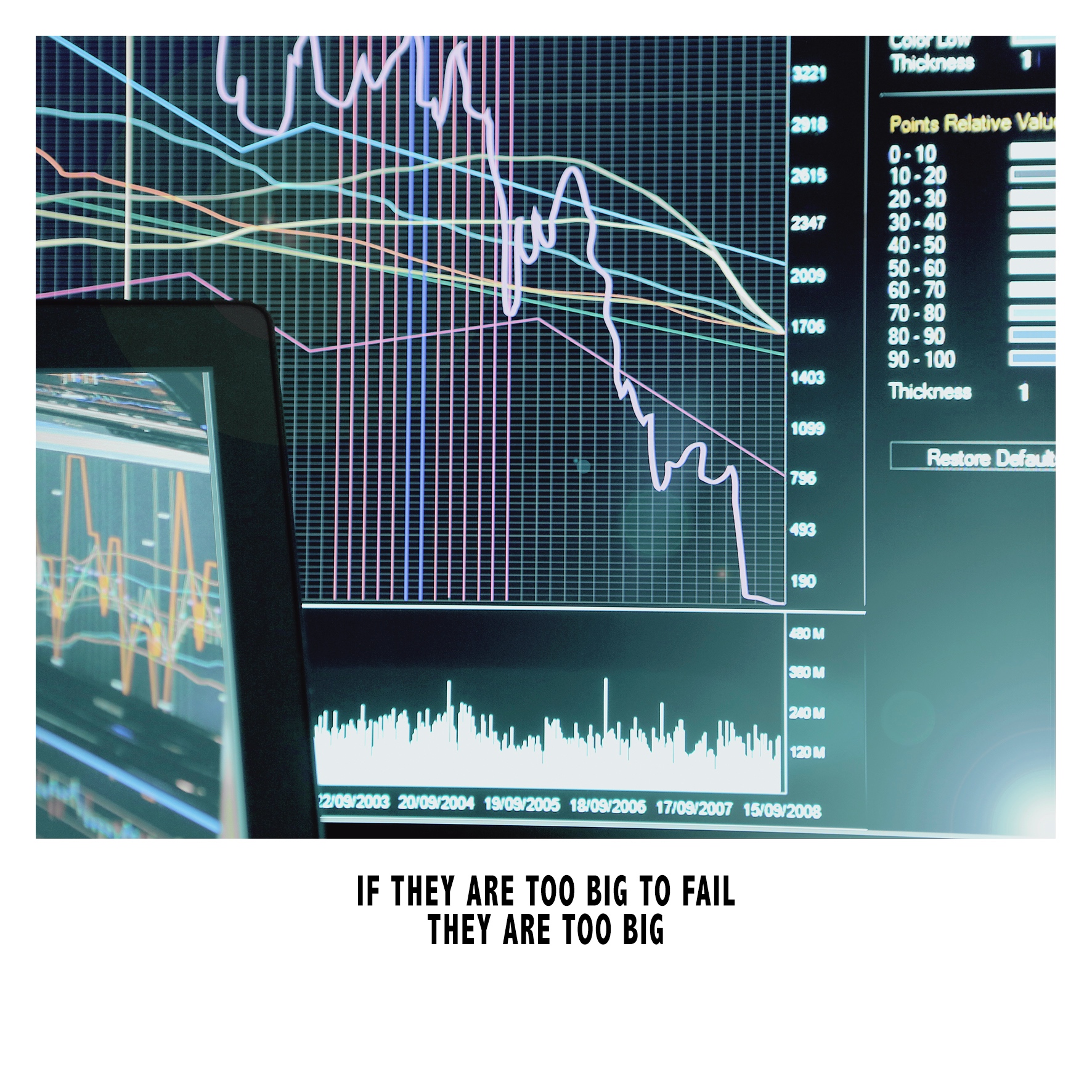 L’implosione del mercato finanziario e la conseguente catastrofe dei primi anni del nuovo millennio viene raccontato da Nanni Balestrini: ai frammenti de La tempesta di Giorgione (1502-1503 circa), la cui natura idilliaca è presagio di una calamità imminente, si mescolano dollari strappati (a indicare la responsabilità che ha causato il danno speculativo) e lettere casuali, traccia di ciò che rimane di un’umanità incapace di decifrare, rielaborare e resistere all’impatto delle proprie azioni.