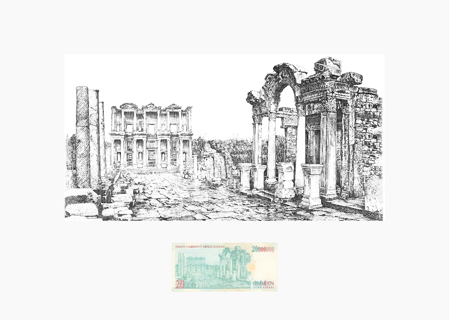 Ryts Monet isola e rielabora gli elementi naturali, come piante e fiori, e architettonici riportati sulle banconote, amplificando i paradossi radicati nelle scelte visive condotte dai paesi per rappresentarsi attraverso le valute: ciascuna delle opere esposte ci permette infatti di disarmare il campo minato che si nasconde all’interno dell’universo delle monete, facendo emergere da un lato la ricerca di una monumentalizzazione dell’immagine internazionale attraverso il denaro, dall’altro il cortocircuito creato dall’emblematica e ricorrente presenza di specificità naturali.