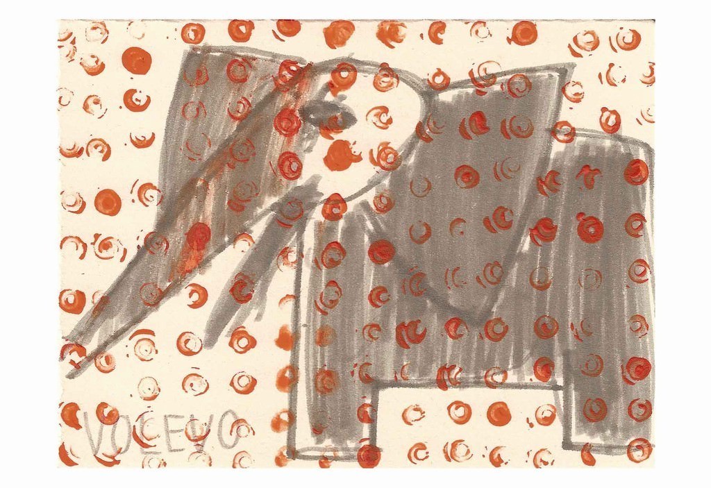 Pecore, elefanti, rinoceronti, gatti si snodano in opere in formato cartolina, in una contaminazione tra giochi di parole e pennellate fulminanti di colore, che vuole essere anche momento di denuncia.