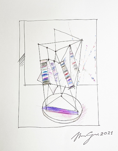 Scrive Carlo Franza nel testo: “Installazioni, fotografia, performance, linguaggi multimediali e molto altro, sono il parlato visivo dell’artista Monica Gorini e del suo furore, del dono della creatività che si spinge verso un’estremizzazione del concetto di limite, di rapporto tra l’esistente e i significati che l’esistente mostra. Nel tracciato tra inconscio e conscio, il tramite è il mestiere, che ogni artista si fabbrica da solo, specie nella contemporaneità. L’artista è quasi obbligato, dalla sua stessa forza, a praticare il percorso della creazione, fino allora finita; da questo assunto occorre partire per leggere questa mostra che presenta una serie di disegni, di appunti, di studi, di idee. Beninteso, non che questi fogli siano da meno di opere finite, anzi si mostrano in tutta la loro freschezza e illuminazione. Sono a mio avviso opere compiute. Linee, tracciati, esagoni, triangoli, cerchi, rettangoli, angoli, frattali, geometrie dell’universo, tutto si mostra in un linguaggio basato su ciò che percepiamo e che, secondo la scienza attuale, è molto diverso dalla realtà. La realtà atomica delle cose, di un oggetto, di un dipinto, di una scultura, di un foglio di carta è uno spazio nel quale si aggirano sistemi di particelle che poco hanno in comune con l’apparenza di ciò che vediamo. Monica Gorini con questi disegni esplora l’invisibile e lo traduce in materia, geometria e forme pittoriche. Questi disegni della Gorini oscillano tra rigore scientifico ed emotività, tra logica e intuizione. La percezione del mondo vivente come rete di relazioni rende il ragionare in questa prospettiva la caratteristica fondamentale del pensiero sistemico. La Gorini con istinto e speculazione critica ha creato un proprio linguaggio, immagini vitali ma indefinite, diventate icone. Arte astratto-geometrica che si spinge, pur con una spiritualità contenuta, verso un costruttivismo utopico, costruttore di ordine e progetto”.