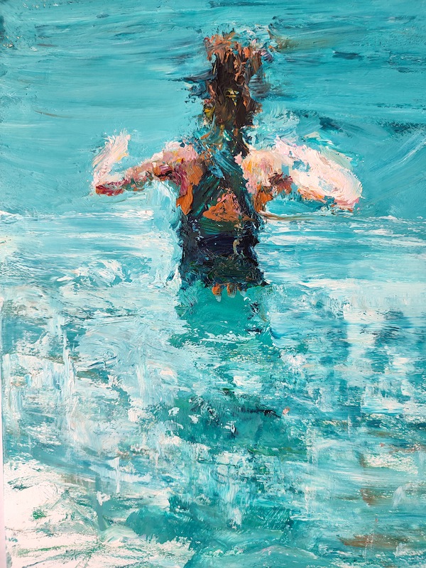 In Leona il taglio dell’immagine è contemporaneo, ravvicinato e volutamente casuale, come in una foto scattata al momento sbagliato; i visi si perdono nel colore materico e stratificato, sfaldato ai limiti dell’informale: l’intento è di cogliere l’atmosfera dell’emozione che sta per giungere – l’adrenalina che sale prima di tuffarsi, l’attesa o la paura davanti all’onda in arrivo, la percezione dell’acqua che scorre sul muschio. La scelta di rappresentare le scene come se l’osservazione avvenisse a occhi socchiusi, con forme sfaldate e quasi disgregando la compattezza delle masse pittoriche, è la stessa espressa da Munch all'inizio del suo percorso: nel nostro caso utilizzata non per rendere un sentimento doloroso bensì per esprimere un’emozione vitale, l’esigenza di immergersi in un universo solare, il desiderio di fondersi nell’eterna energia universale fino a vibrare con lei.