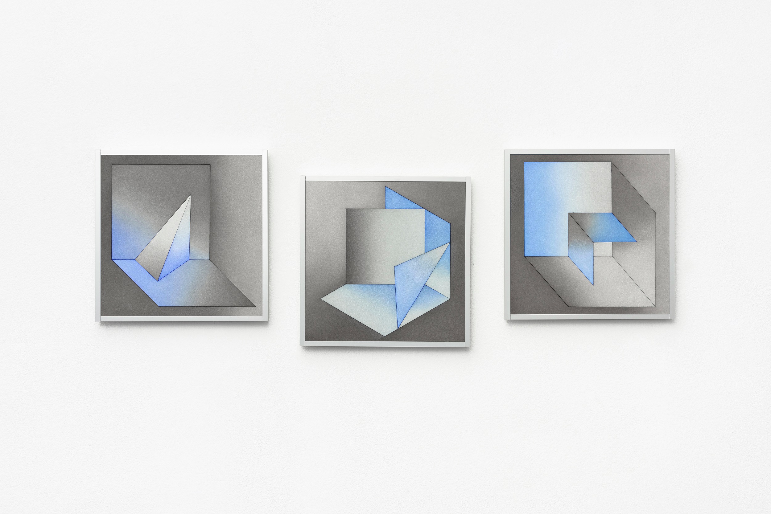 Le opere esposte (bidimensionali e 1 tridimensionale in alluminio) sono una serie di lavori in cui i moduli e le proporzioni geometriche vanno oltre le finalità tecniche costruttive e compositive, con l’intento di costruire visivamente una “sintesi architettonica emozionale”.