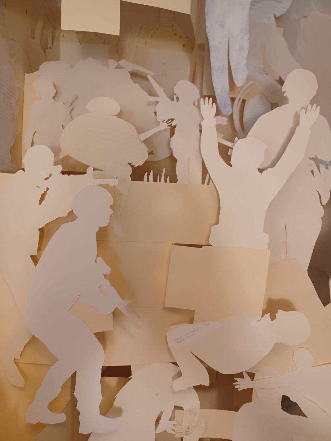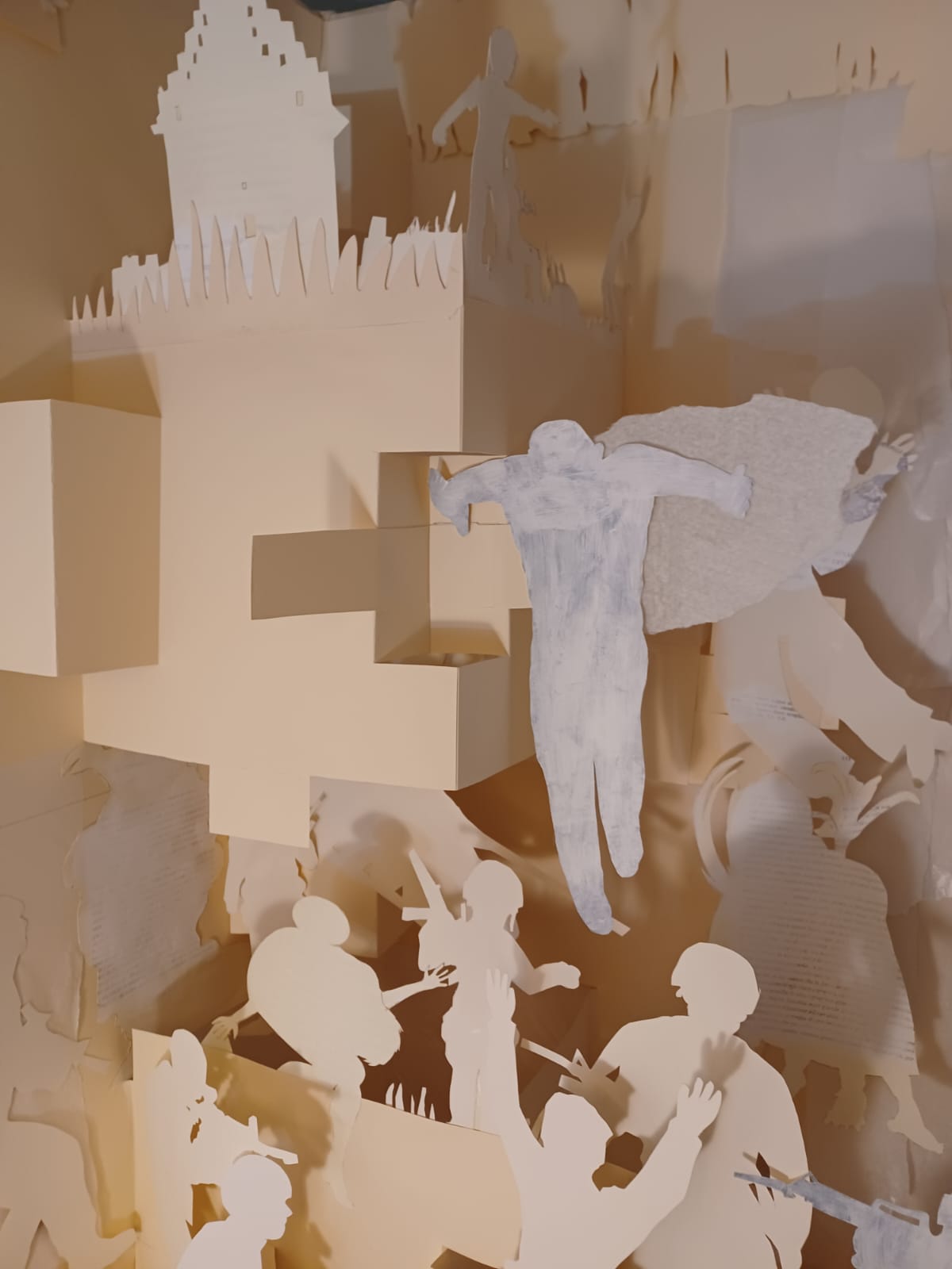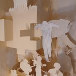 L’installazione presenta un’opera totalmente realizzata in carta di recupero di dimensioni di circa 300 cm x 300 cm, sospesa a circa 300 cm da terra. L’opera realizzata prevalentemente in carta riciclata, ovvero libri recuperati, lesionati o smontati, trasformati in più di 120 sagome diviene narrazione di diverse scene ove oltre alle geometrie, alle architetture, agli ambienti naturali è popolato da numerose presenze umane. La carta di diverse grammature e specie è in prevalenza bianca nelle differenti declinazioni, dalle veline di tonalità bianco titanio, alla carta 300 gr. colore avorio, panna, avorio etc.. All’interno delle teche della Biblioteca troveranno alloggiamento circa trenta sketch book, pop up, carte, che sono il percorso di circa 8 anni di lavoro dell’artista visuale.