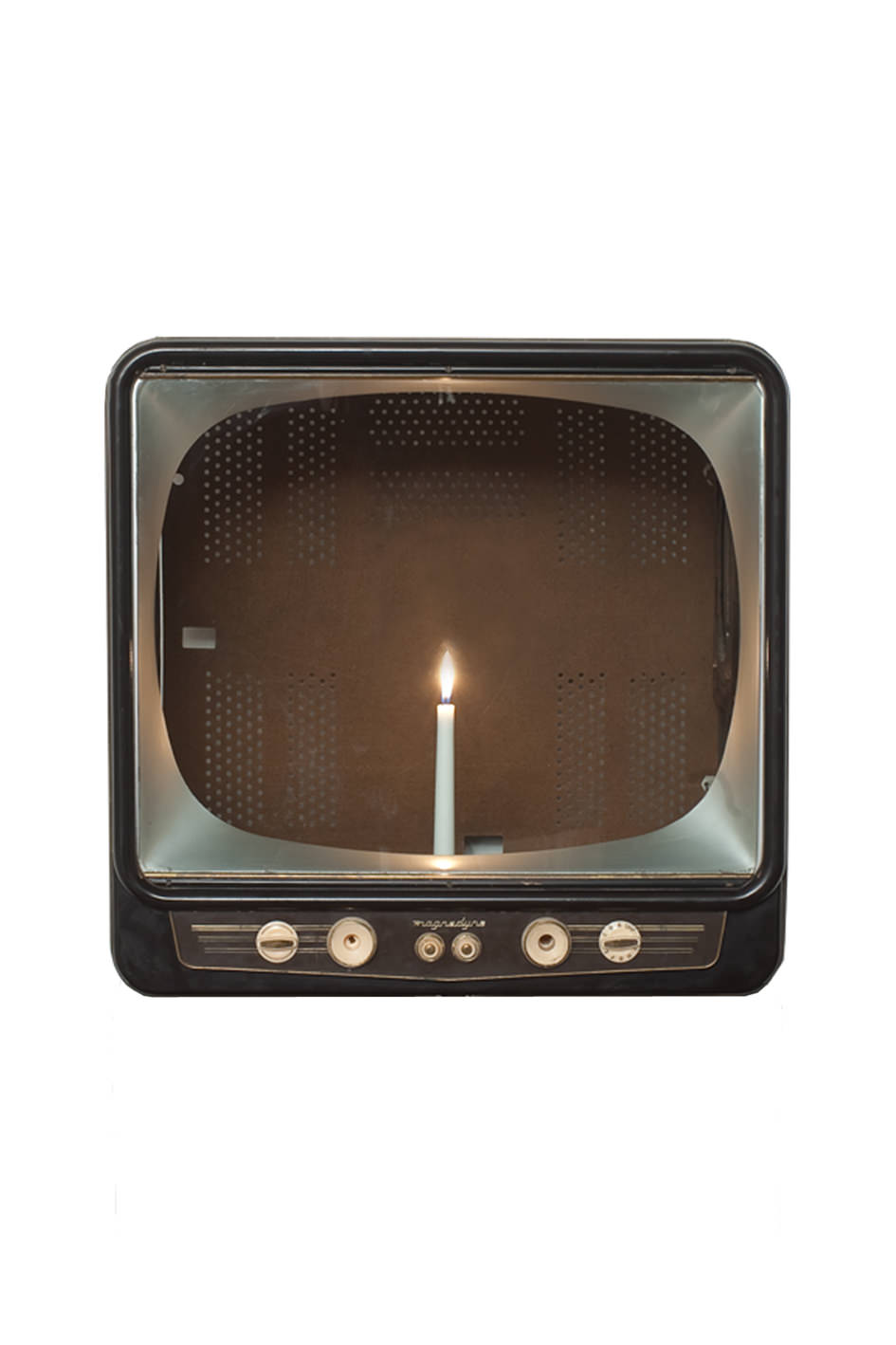 Ed ecco la sala dove ho messo insieme, convitati al lume di candela, Kounellis e Nam June Paik. Il lavoro di Kounellis è una lamiera a parete con due mensole, l’inferiore dove poggia un trenino, e la superiore dove brucia la fiamma di una candela. Si coglie una lontana eco di De Chirico, forse anche di Magritte. Il fatto è che Jannis sente profondamente metafisica e surrealismo e li reinventa, almeno in quegli anni, questo pezzo è del 1970, con materiali poveri. E con esiti lirici. Qualche metro più in là, addossato al muro, c’è un vecchio televisore svuotato dell’artista coreano Nam June Paik, all’interno del quale brucia solitaria una candela. Il mezzo di comunicazione di massa, il più petulante e consumistico che ci sia, acquista un’anima, si spiritualizza. E’ un’immagine zen. Chi poteva concepirla se non un orientale?