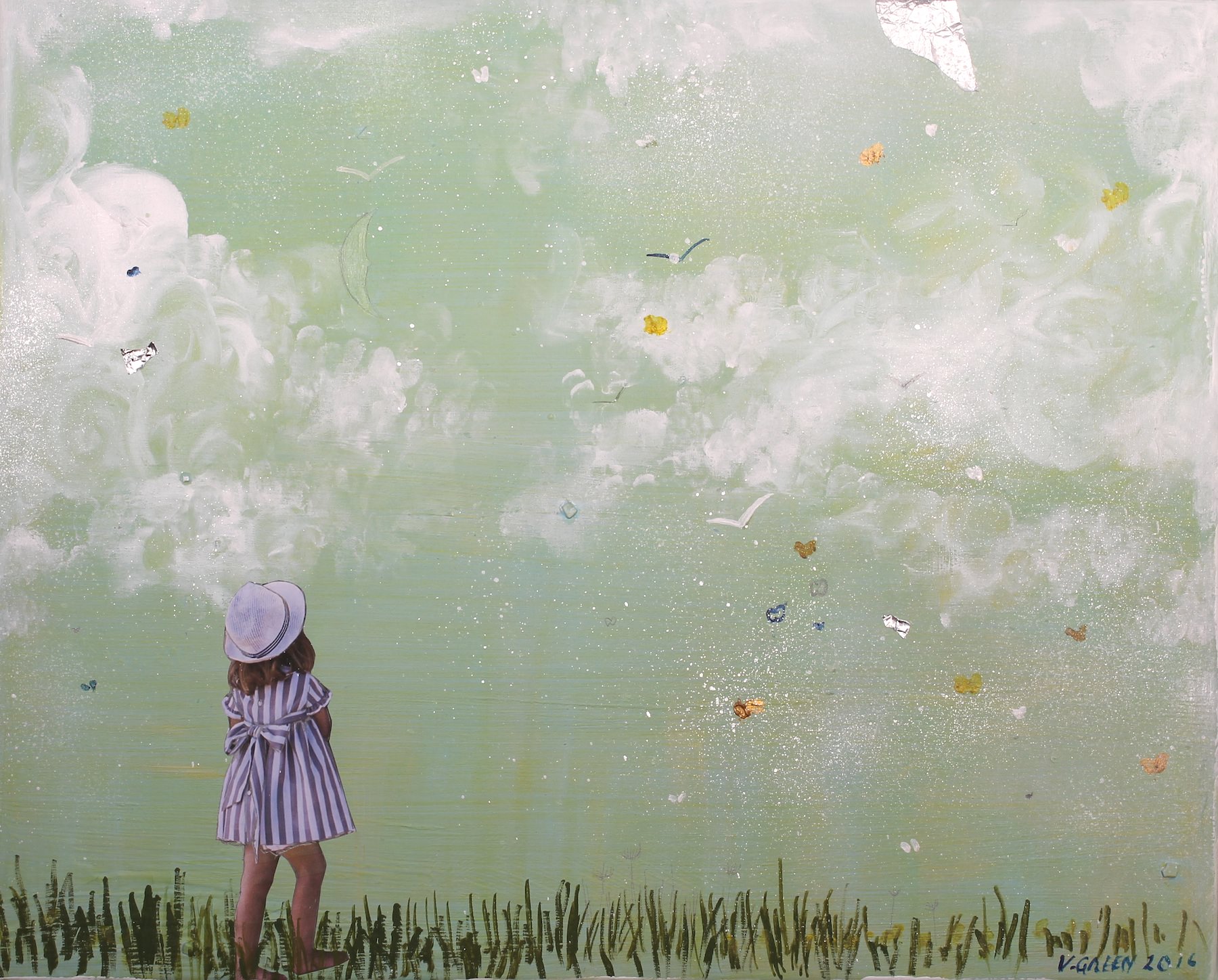 Veronica Green (Nuova Zelanda 1984) interpreta l’istinto artistico in modo sognante e fantastico: le sue tele ci catapultano in mondi a metà tra il sogno e la realtà, là dove ogni elemento è pregno di significati simbolici e visionari. Le sue opere poetiche e pittoriche sono illuminate dal chiaro di luna attraverso cromie lucide e tenere e da uno sfumato morbido e arioso che delinea una nuova dimensione magica e sospesa. I personaggi delle tele chiacchierano allegramente di giorno e sussurrano di notte, quando si spengono le luci e l’effetto fosforescente risplende, e la foglia d’oro sfavilla in tutta la sua ricchezza.