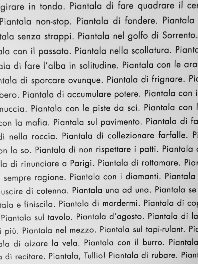 Tra le opere esposte dal 14 Novembre al 14 Febbraio al Caffè Cucchi, i manifesti inediti “Milano è…”, un omaggio poetico alla nostra città, “Bevo vivere”, un viaggio di parole nelle emozioni del buon bere, un manifesto dedicato al “Caffè” pieno di intuizioni e altro ancora. A questi inediti si accompagnano altri manifesti esposti in molti eventi di arte contemporanea tra cui il celebre “Ti amo”, in versione per Lei e per Lui, e quello dedicato ai “No” del nostro tempo da cui ha avuto inizio questa ricerca, oltre che “Piantala!”, testo salvifico che aiuta a ritrovare buon umore nei momenti difficili.