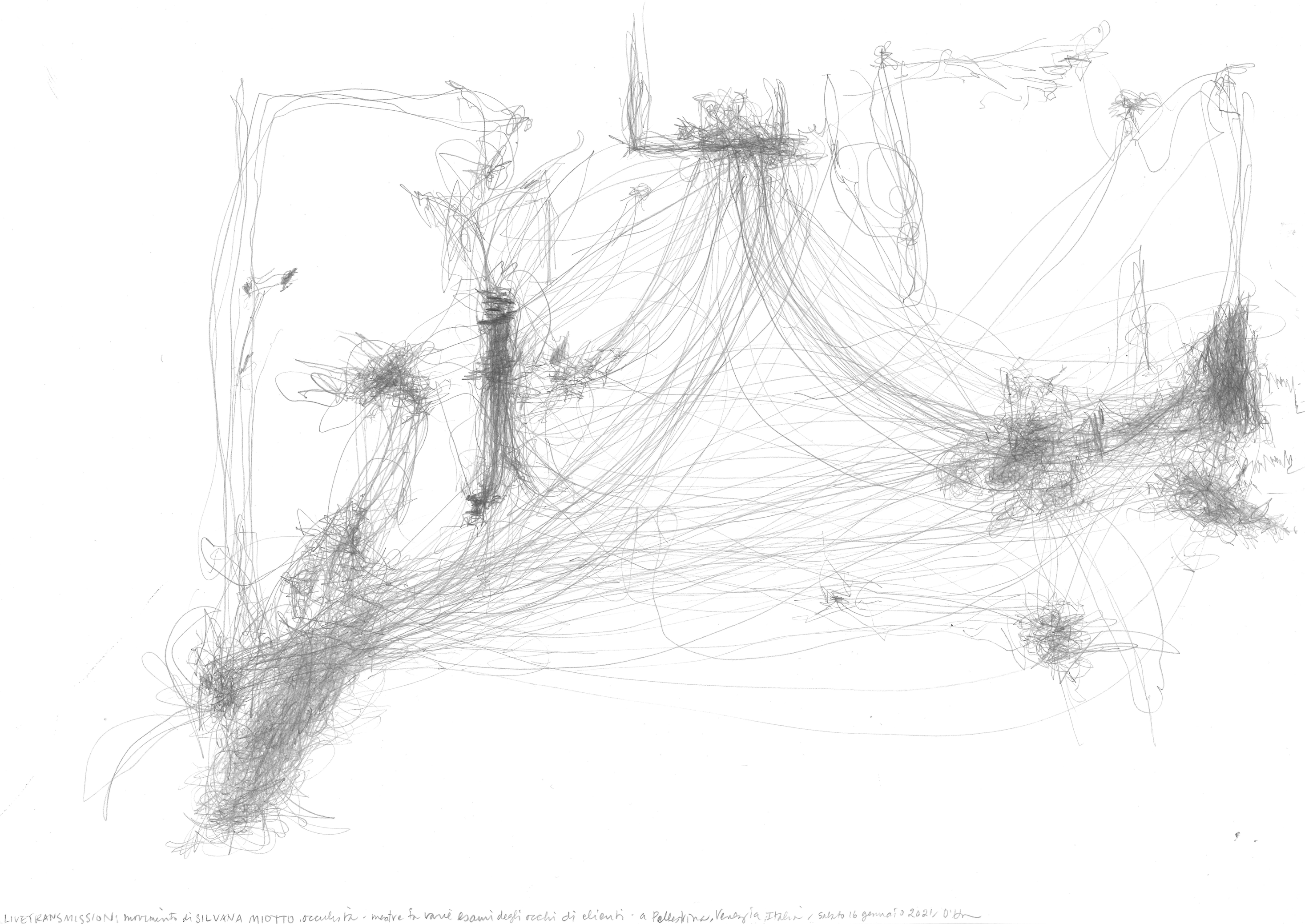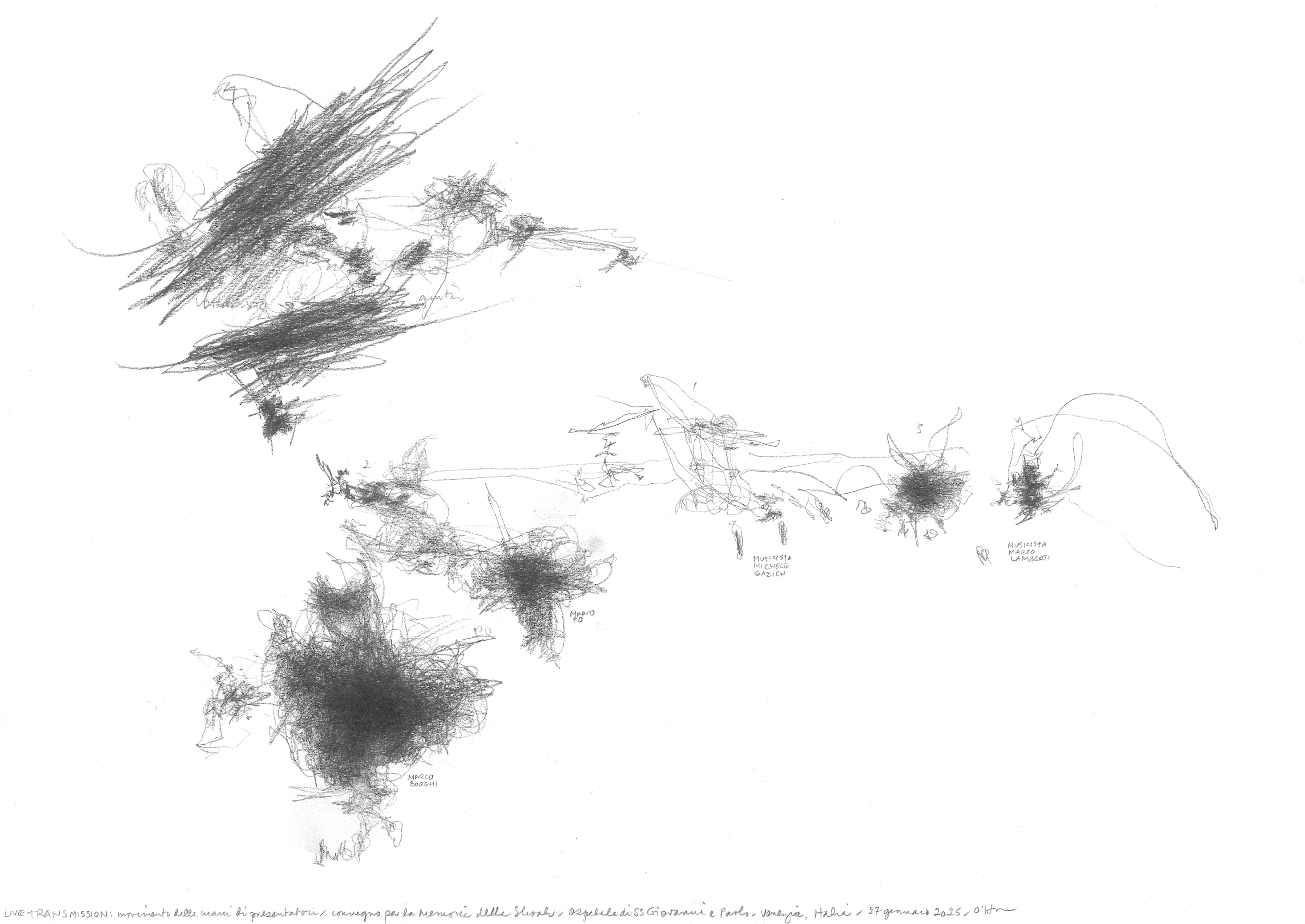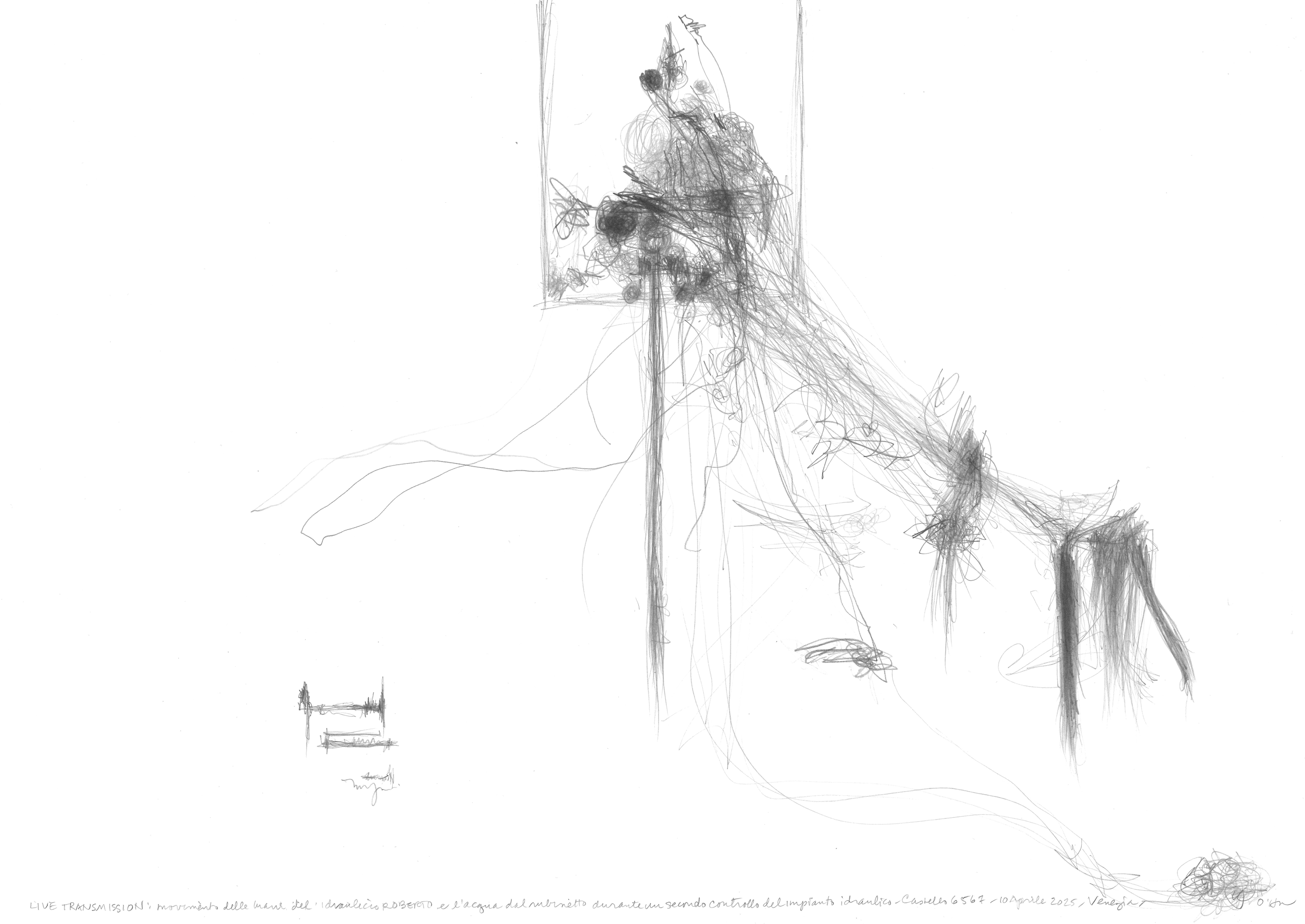 In occasione del vernissage, venerdì 30 gennaio, dalle 17 alle 20, l’artista realizzerà una Live Transmission dal vivo (dalle 18.30), offrendo al pubblico la possibilità di assistere direttamente alla pratica che è al centro della sua ricerca: un processo di osservazione e disegno in tempo reale capace di rendere visibili i flussi del movimento umano. Durante il vernissage verrà inoltre presentato il libro d’artista realizzato per l’occasione e pubblicato dall’Editore Cichino Brigante, in tiratura limitata.