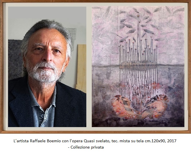 L'arte per Raffaele Boemio è ricerca e ossessione. Un raccontare per arie sottili e per frammenti sottesi di materia lirica recuperati dalla memoria e rinati in uno spazio mentale carico di umori e essenze nascoste. Il percorso artistico e pittorico comprende un periodo di oltre 53 anni di lavoro sempre teso a ricercare un senso concreto da assegnare alla vita. Un lungo e intenso lavoro svolto dal 1971 a oggi a partire dal ciclo iniziale “Biographico” e poi, dalle opere digitali di “Afona”, “Quasi svelato” in cui la dimensione ambientale ha sempre avuto nella sua ricerca un ruolo e un potere evocativo. L’attuale ciclo pittorico chiamato “Semiosi” accoglie i precedenti cicli e sintetizza appieno con un linguaggio maturo e coinvolgente tutta la sintesi assorta e visionaria dell’artista campano. Una pittura rinnovata e evanescente che nasce dai meandri oscuri della memoria per condensarsi in modo provvisorio e precario in un tempo sospeso della realtà e della vita. Le opere in particolare dell’ultimo ciclo - scrive Sandro Bongiani - “riflettono una dimensione che trascende il visibile, restituendo una visione inedita e in evoluzione del paesaggio che si apre alla rivelazione con una forte energia nascosta. Una natura del tutto inaspettata in cui la germinazione e la riemersione diviene presupposto sfuggente dell’apparire tra terra e cielo di presenze e forme indefinite che nella trascendenza e nella immediatezza condividono l’attesa e l’incertezza del mondo”.