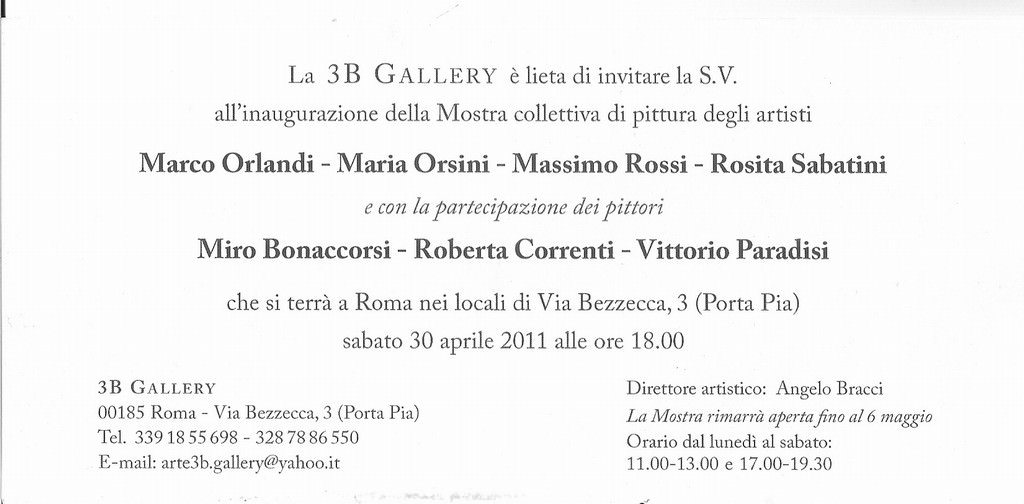 La 3B Gallery è lieta di presentare l’inaugurazione della Mostra collettiva degli artisti Marco Orlandi-Maria Orsini-Massimo Rossi-Rosita Sabatini. Con la gentile partecipazione dei pittori Miro Bonaccorsi, Roberta Correnti e Vittorio Paradisi.