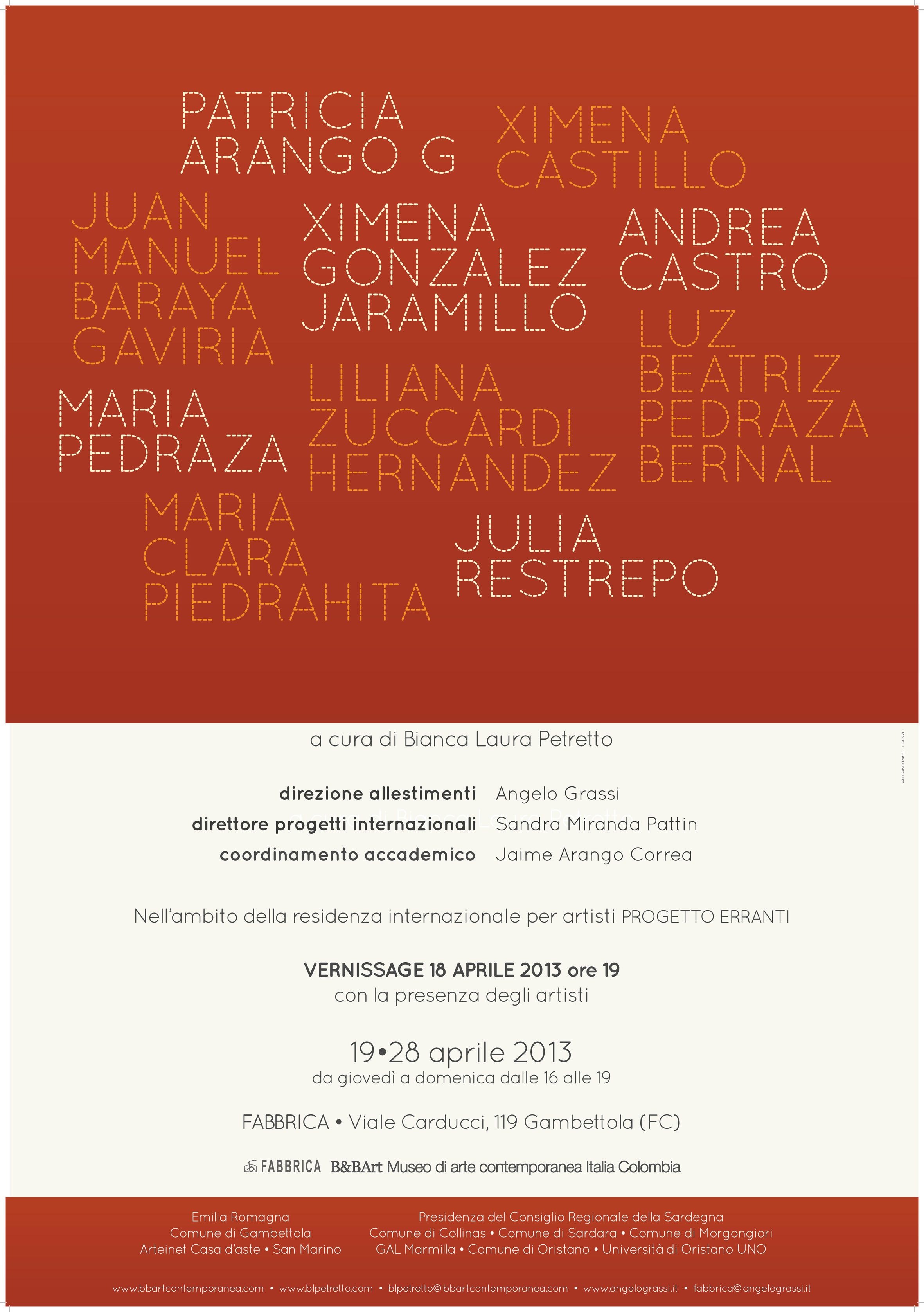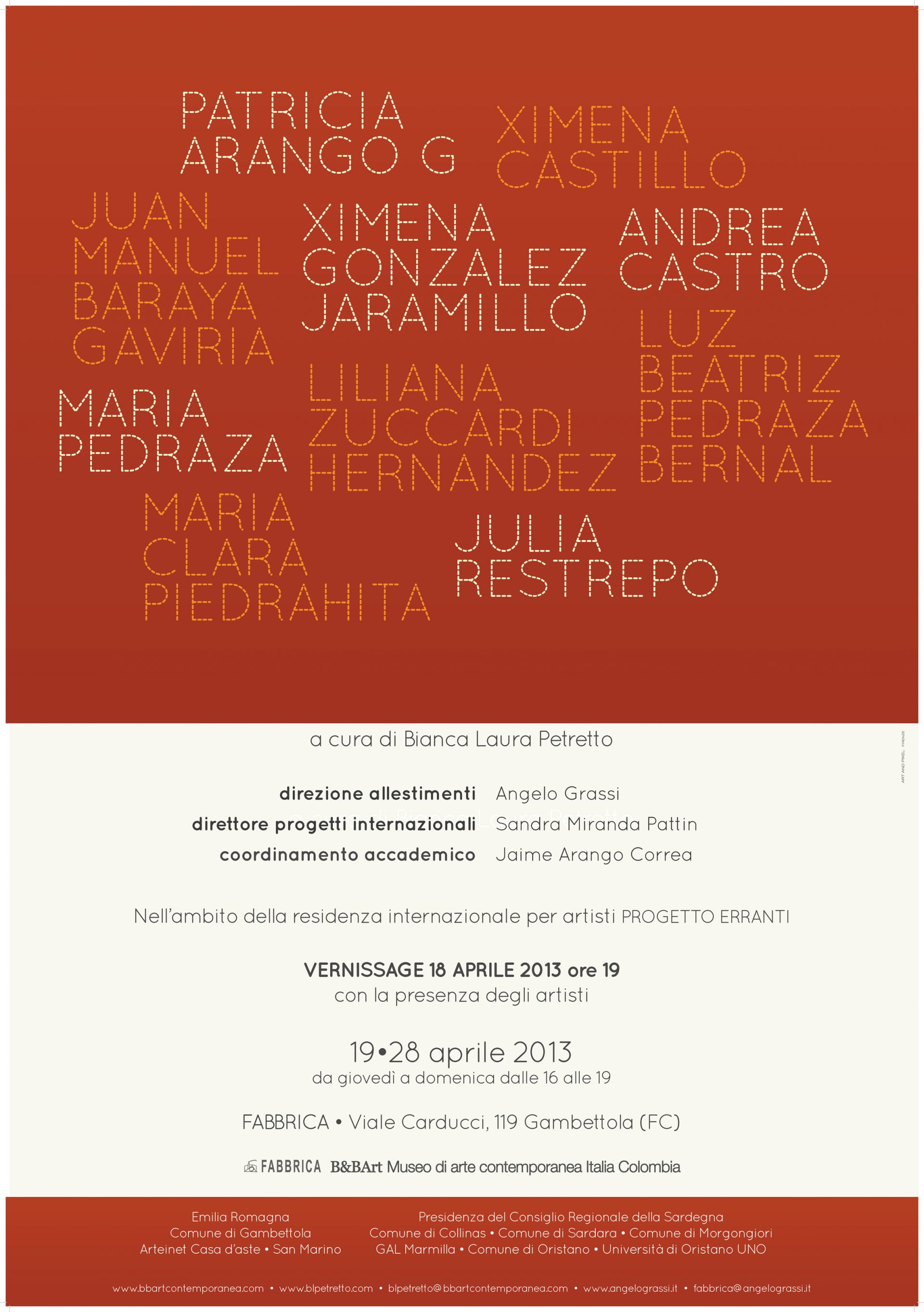 Molti gli appuntamenti, gli incontri con gli artisti e gli intellettuali locali, con gli amministratori e con le realtà del territorio, visite a musei e strutture espositive in Sardegna e in Emilia Romagna per produrre e lasciare traccia del lavoro artistico attraverso una esposizione collettiva degli artisti colombiani nell’ambito del Progetto Erranti che inizierà a Fabbrica con il vernissage del 18 aprile per terminare il 28 aprile e successivamente approdare, in modo differente nei mesi successivi con NOMAS II dal 1 maggio al 15 luglio 2013 a B&BArt Museo di arte contemporanea Italia Colombia, in Sardegna a Collinas.