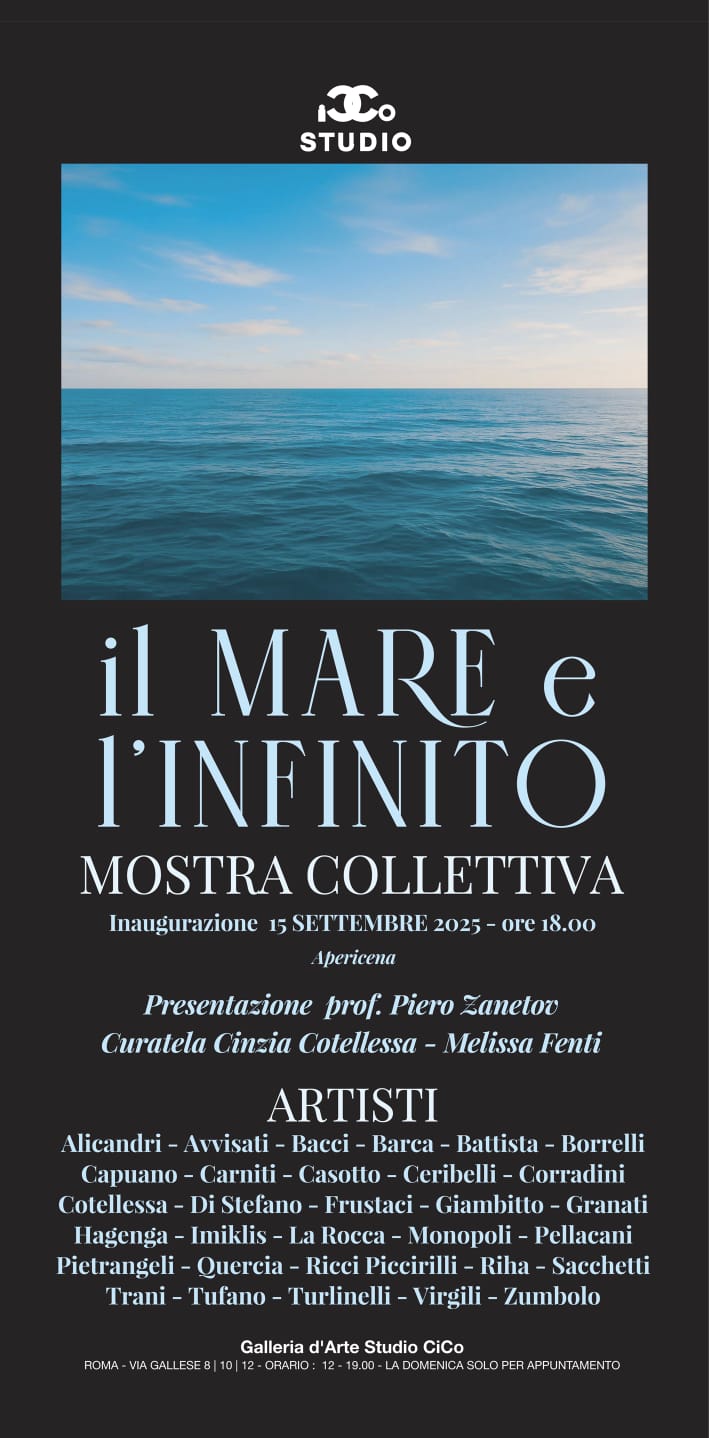 La Galleria d’Arte StudioCiCo è lieta di presentare la mostra collettiva “Il Mare e l’Infinito”, in programma dal 15 al 29 settembre 2025 presso la sede di Via Gallese 8 a Roma. L’inaugurazione si terrà lunedì 15 settembre alle ore 18.00.