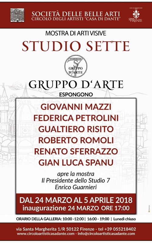 Sabato 24 Marzo 2018 presso le sale espositive della Società delle Belle Arti – Circolo degli Artisti “Casa di Dante” di Firenze, in via Santa Margherita 1R, si terrà l’inaugurazione della Mostra di Arti Visive dello Studio Sette Gruppo d'Arte. Lo Studio Sette, storico gruppo fondato nel 1970, propone una esposizione dove ogni artista si confronta con i colleghi intessendo interessanti dialoghi tra tecniche e stili differenti.