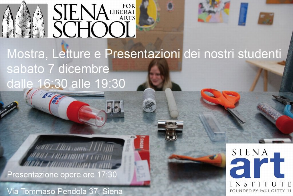 Il Siena Art Institute e la Siena School for Liberal Arts vi aspettano alla Mostra di Fine Semestre dei lavori di pittura, scrittura creativa, disegno, installazione, video, fotografia e tecniche miste realizzati dai propri studenti.