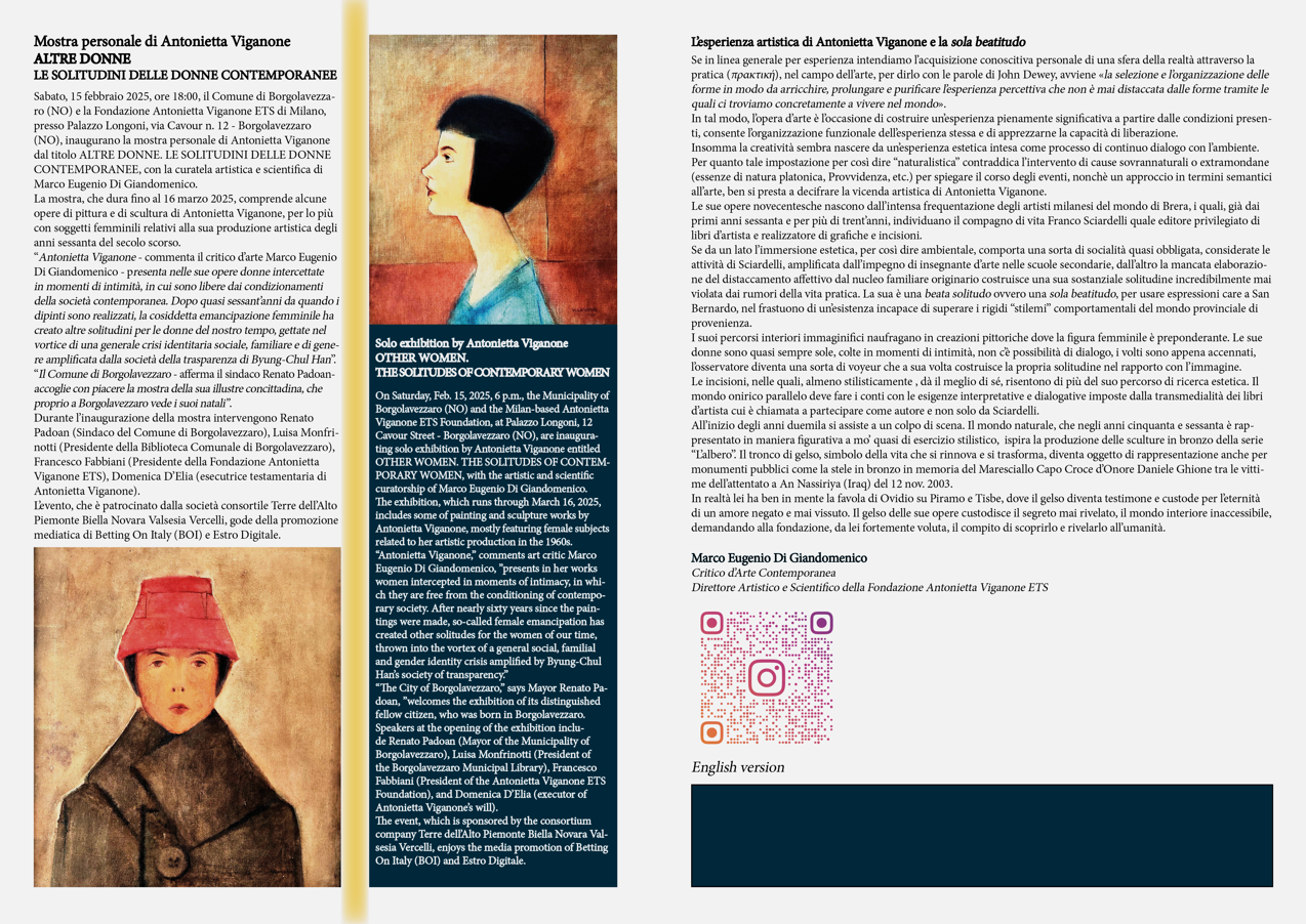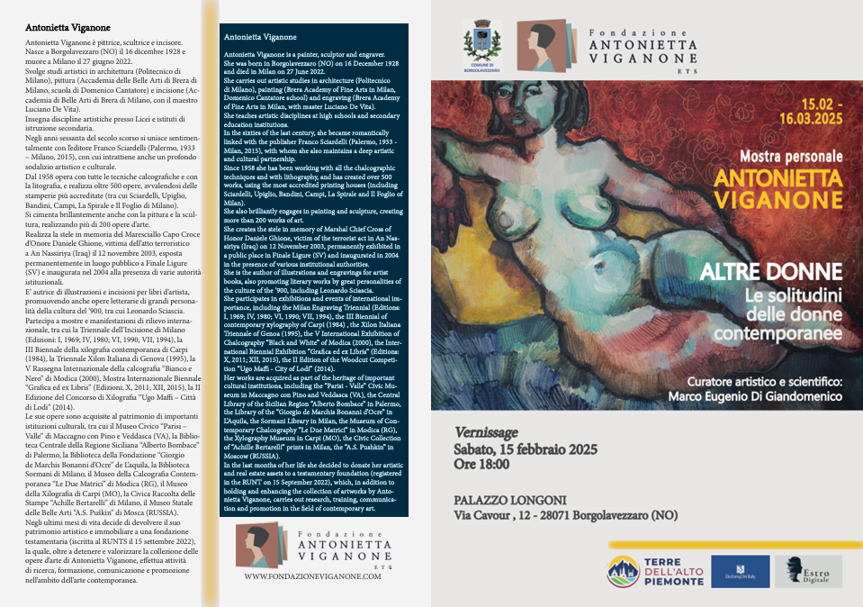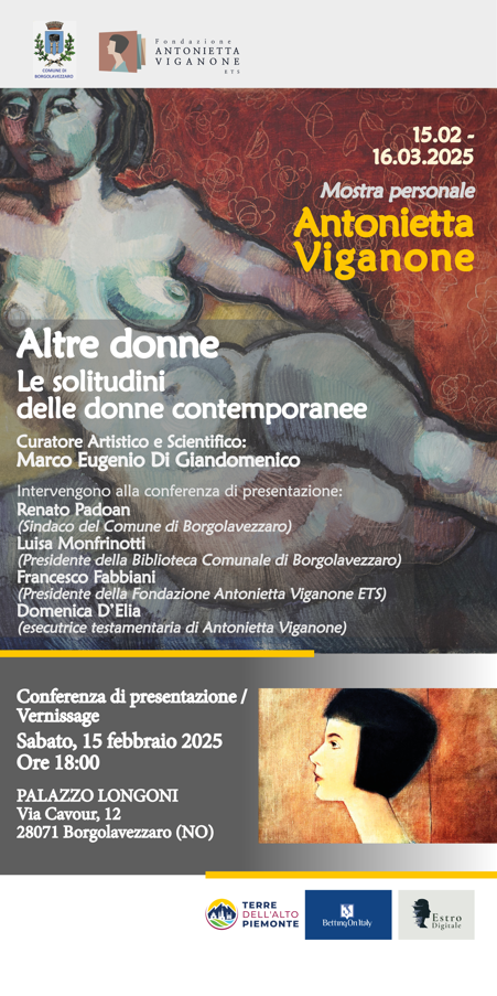 Mostra personale di Antonietta Viganone dal titolo ALTRE DONNE. LE SOLITUDINI DELLE DONNE CONTEMPORANEE, organizzata dal Comune di Borgolavezzaro (NO) e dalla Fondazione Antonietta Viganone ETS, a cura del critico d’arte Marco Eugenio Di Giandomenico.