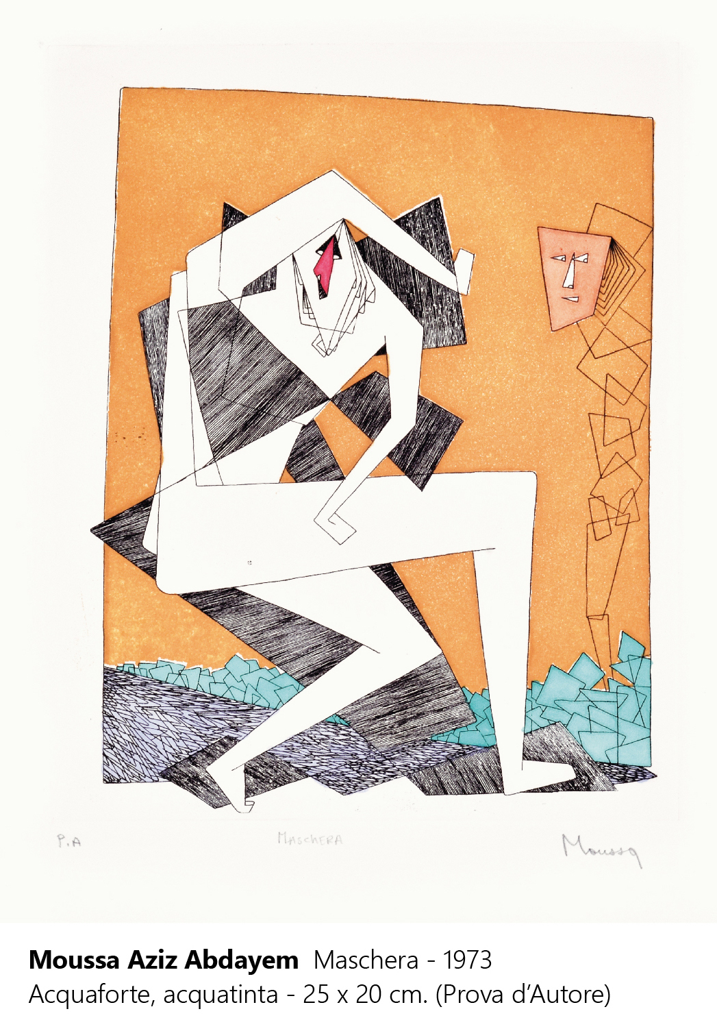Moussa Aziz Abdayem (1947-2020) nasce a Zahle, in Libano. Conclusi gli studi al Center of Fine Arts di Beirut, si trasferisce in Italia dove continuerà la sua formazione artistica, diplomandosi nel 1971 all’Accademia di Belle Arti di Roma. Allievo del pittore e incisore Lino Bianchi Barriviera, approfondisce lo studio della grafica incisa, focalizzando poi principalmente su questo campo la sua ricerca. Nel 1974 fonda a Roma la stamperia “M2M” e contemporaneamente inizia ad insegnare “Tecniche dell’incisione” in diverse accademie, da Sassari e Bologna, sino a Frosinone ed infine a Roma. Grazie alla sua profonda conoscenza dei mezzi e degli strumenti dell’incisione, Moussa ospiterà nella sua stamperia artisti di rilievo internazionale, tra i quali si ricordano Cagli, Pirandello, Sughi, Twombly, Matta, Masson, Mirò. Dai primi anni settanta partecipa a diverse esposizioni in Italia e all’estero, in particolare in Libano e Iraq, dove si tengono anche alcune sue mostre personali. Tra i vari riconoscimenti e premi si ricordano il Premio Minerva (Ministero della Pubblica Istruzione, 1972), il premio all’Assessorato alle Antichità del Comune di Roma (1971), il Premio Pandosia (Cosenza, 1979), l’Art Mogao Caves (Cina, 2019).