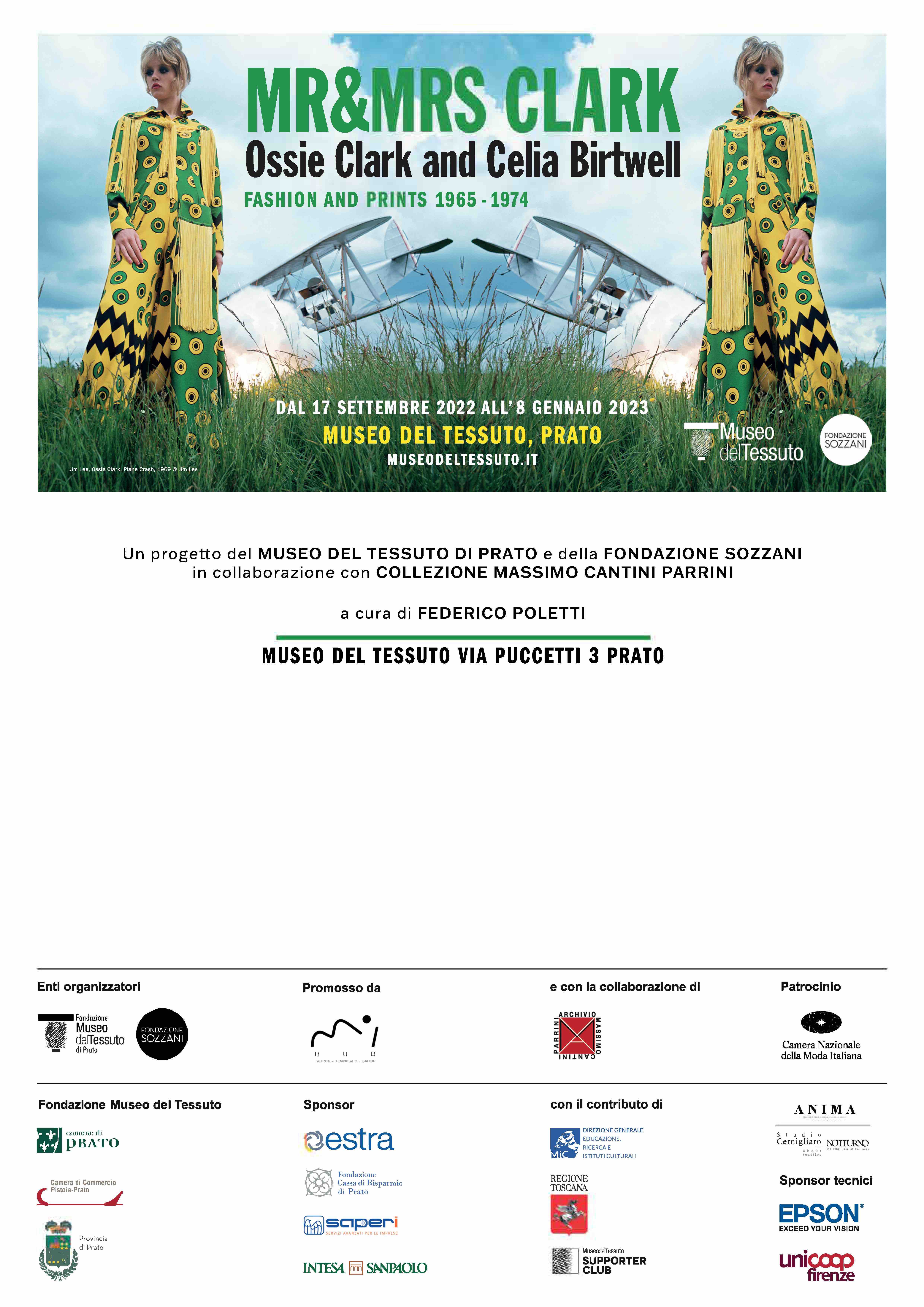 Mr & Mrs Clark. Ossie Clark and Celia Birtwell. Fashion and Prints 1965-1974 è un progetto, condiviso tra il Museo del Tessuto di Prato e la Fondazione Sozzani. La mostra, a cura di Federico Poletti, sviluppa e valorizza un importante nucleo di abiti disegnati dallo stilista londinese e provenienti dalla preziosa collezione di Massimo Cantini Parrini, celebre e pluripremiato costumista. A quel nucleo iniziale di abiti, le ricerche di Federico Poletti hanno aggiunto materiali inediti, provenienti dalla collezione privata di Lauren Lepire a Los Angeles, e dagli archivi di Celia Birtwell e dalla famiglia Clark.