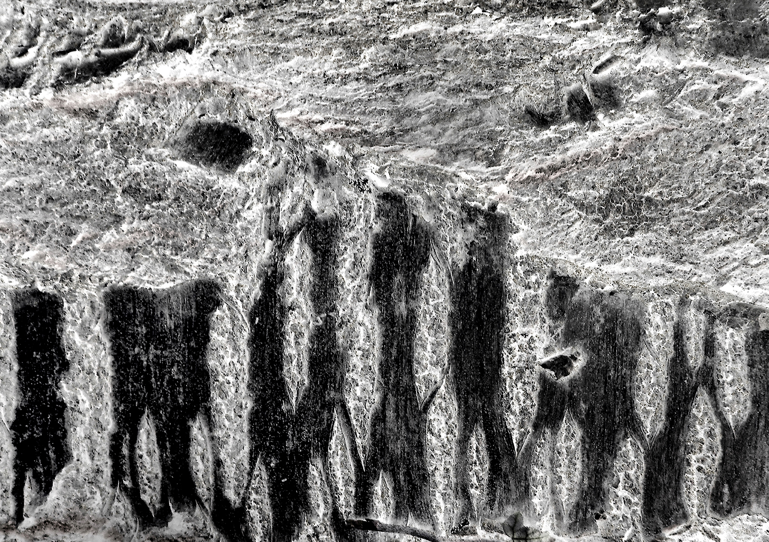 Dettagli di cortecce, rocce, sassi, divengono paesaggi incantati, montagne, rive di fiumi, danze rituali, attraverso la rilettura della fotografia realizzata in coppia.