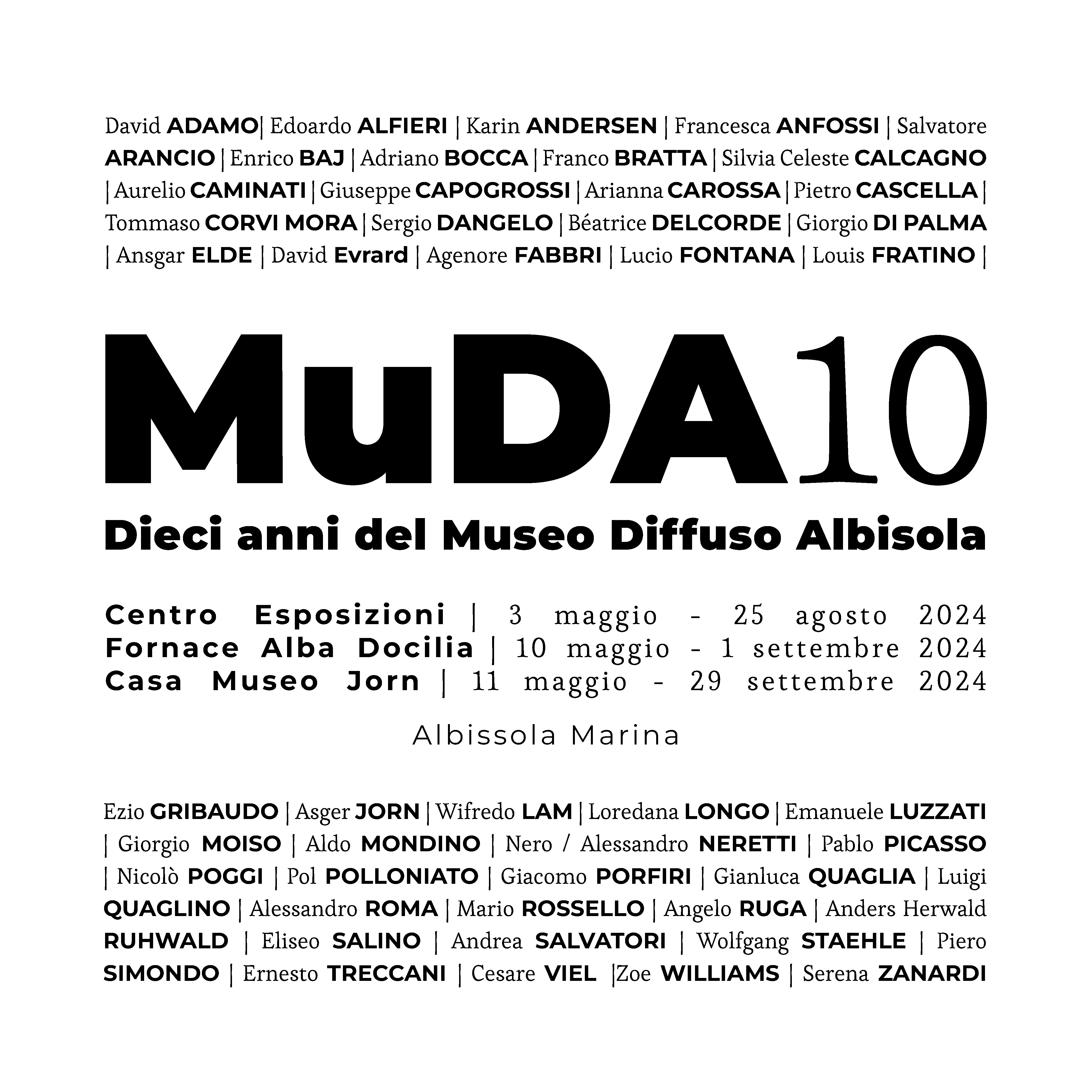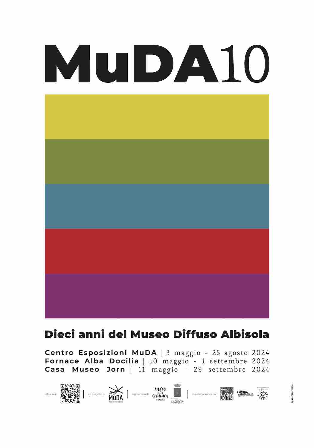 Il progetto espositivo di MuDA10 coinvolge le tre sedi civiche del MuDA (Centro Esposizioni, Fornace Alba Docilia e Casa Museo Jorn) e prevede tre diverse mostre per raccontare questi primi 10 anni di attività museale.