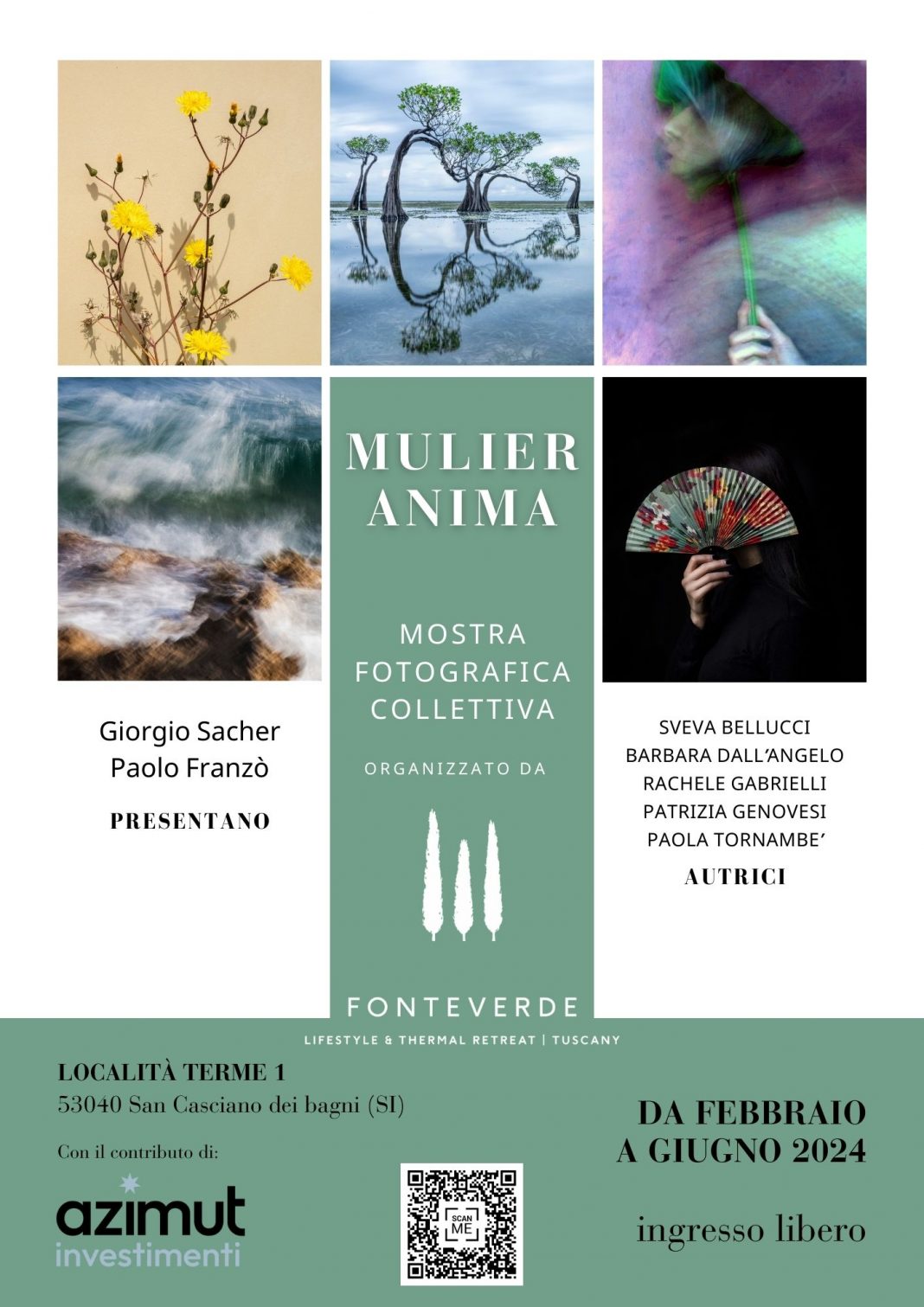 Giorgio Sacher e Paolo Franzò presentano al Fonteverde Lifestyle & Thermal Retreat una mostra fotografica collettiva di cinque autrici, dal titolo “Mulier Anima” per offrire al pubblico del centro termale la fotografia d’autore; sensibilità, intimità, ricerca del rapporto persona-natura, con espressioni di sentimento e spirito “gentile”, con dettagli e colori evidenti. Chiaro il riferimento alla Storia della lingua latina e l’italiano prima “volgare” nato nei luoghi della Toscana.