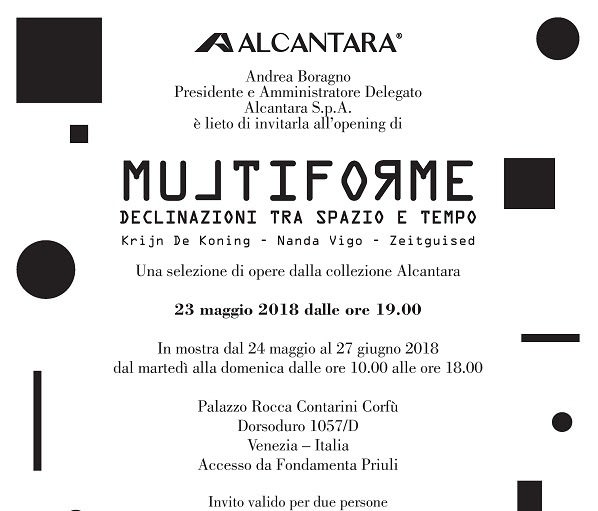 Multiforme, declinazioni tra spazio e tempo è la mostra promossa e prodotta da Alcantara per Palazzo Rocca Contarini Corfù a Venezia in occasione della 16. Mostra Internazionale di Architettura della Biennale di Venezia, aperta al pubblico gratuitamente da giovedì 24 maggio a mercoledì 27 giugno 2018.