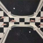 La pluralità di mondi simultanei è rappresentata attraverso geometrie ribaltate e illusioni prospettiche, che ricordano le ricerche di M. C. Escher, e danno vita a luoghi metafisici sospesi nello spazio dove il tempo e le distanze risuonano d’infinito.