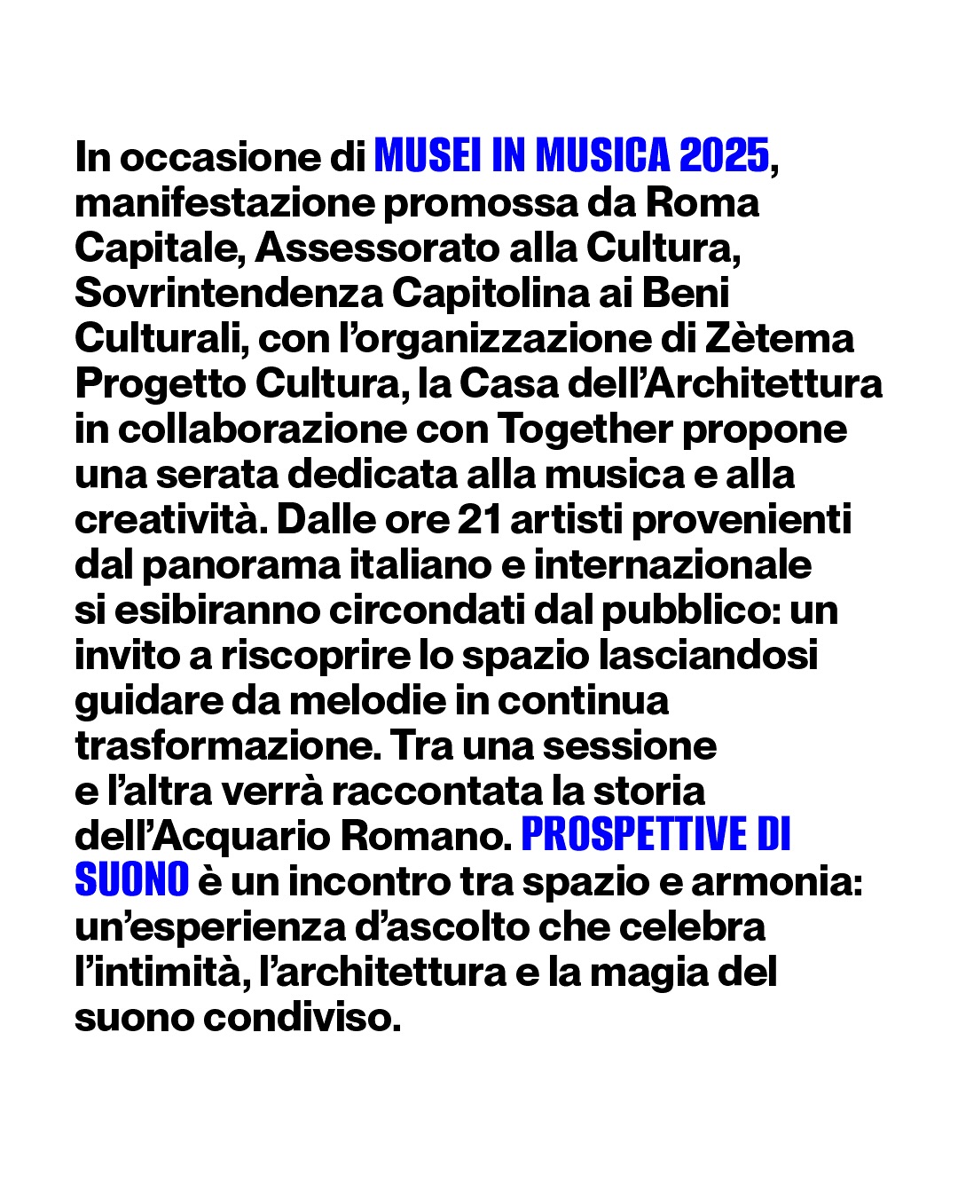 In occasione di Musei in Musica 2025, manifestazione promossa da Roma Capitale, Assessorato alla Cultura, Sovrintendenza Capitolina ai Beni Culturali, con l’organizzazione di Zètema Progetto Cultura, la Casa dell’Architettura in collaborazione con Together propone una serata interamente dedicata alla musica e alla creatività.