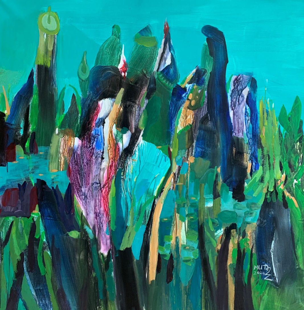 Il nuovo corpus di opere prodotte dall’artista sudanese per l’occasione ne evolve lo stile in un coloratissimo universo vegetale attraverso espressive e più vivaci pennellate. Senza cambiare registro Mutaz Elemam ha trasformato il proprio gesto volgendolo verso nuove soluzioni stilistico cromatiche per accompagnare i suoi racconti visivi, un processo che mette in atto per ogni progetto e che segna un passo verso la riflessione e la comprensione di un’arte interiore. Le numerose velature e stesure di acrilico creano paesaggi a prima vista astratti ma che successivamente trasportano verso riconoscibilissimi angoli popolati da piante, fiori, erbe e alberi stagliati in una fitta verticalità. Il repertorio pittorico attinge a piene mani dalle ambientazioni naturali dei luoghi visitati e della terra d’origine del pittore. Lo spirito di un territorio, che è anche posto dell’anima e del pensiero, torna a vibrare nelle tele dove l’esplosione della pittura diventa incontrollabile e invade lo spazio dando vita alle mille sfumature e alle macchie dalla resa contemporanea eppure radicate nella cultura africana.
