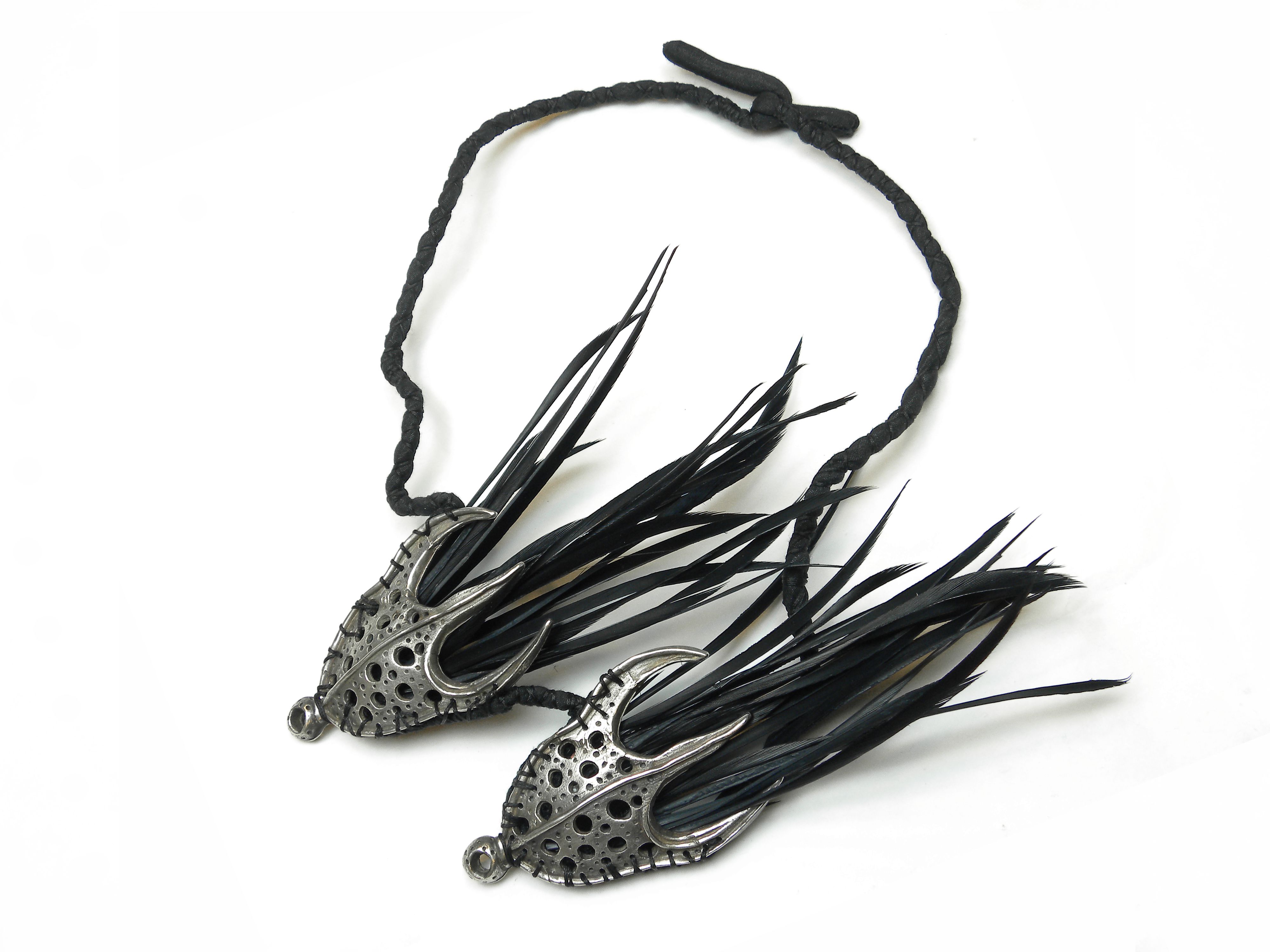 L’irruzione, in controtendenza, dell’umano che ridà vita a ciò che fu. Dove le schegge-paillettes assumono la lucentezza della porcellana o l’opacità del carbone nei tralci che sorreggono geodi di agata, o punte di quarzo. Lo "straniamento" della materia rende le articolate creazioni dell'artista, di una bellezza introspetta, con una forma non convenzionale che una volta indossate divengono simbiotiche.
