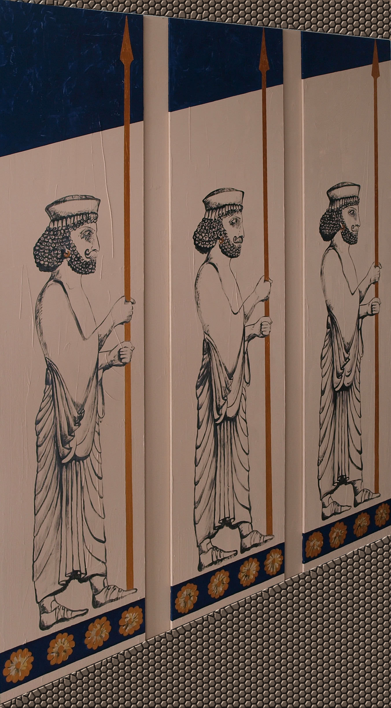 Mentre coraggiosi re guerrieri combattono contro mostri mitici armati di becchi ricurvi, di corna di toro, di artigli leonini, un’altra voce, quella di un antico poeta, ci sussurra sagge massime di vita.