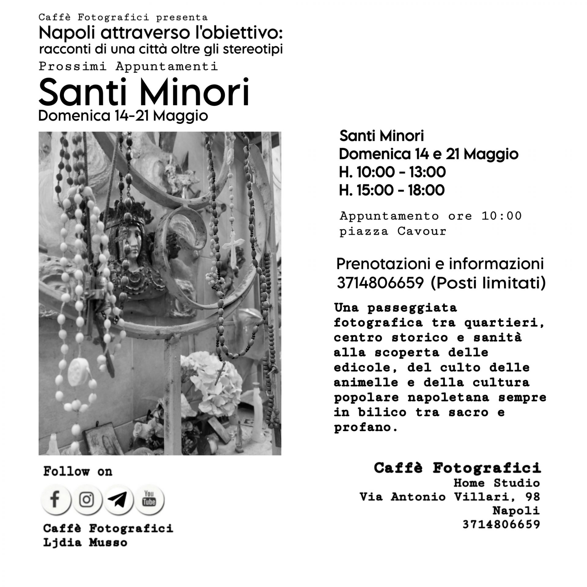Una passeggiata fotografica tra quartieri, centro storico e sanità alla scoperta delle edicole, del culto delle animelle e della cultura popolare napoletana sempre in bilico tra sacro e profano.