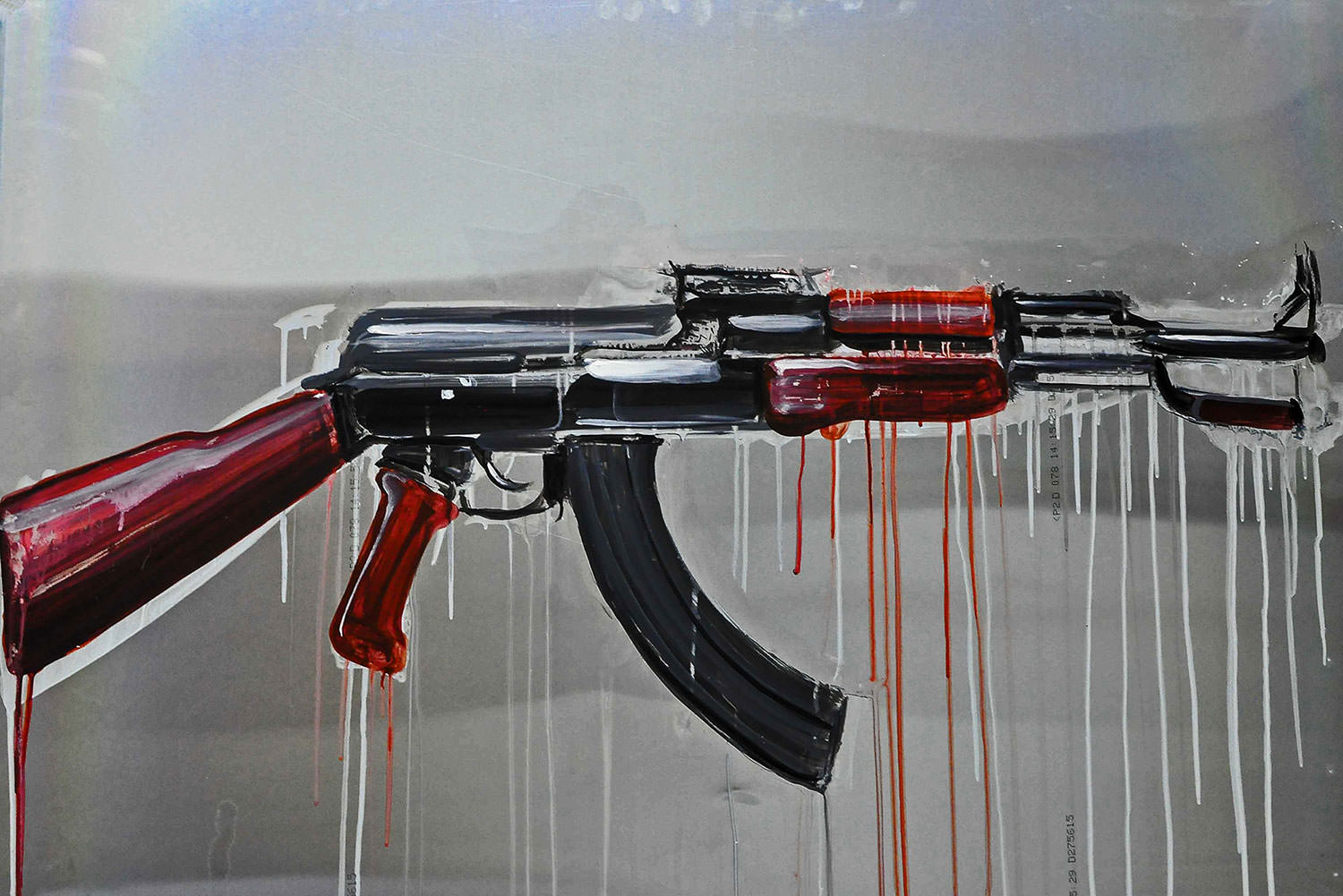 I dipinti di Narcisa Monni riflettono i tratti controversi delle immagini di armi da fuoco, proposte nella doppia veste di oggetto-merce e soggetto pittorico. Sfida al giudizio morale ed estetico dello spettatore.