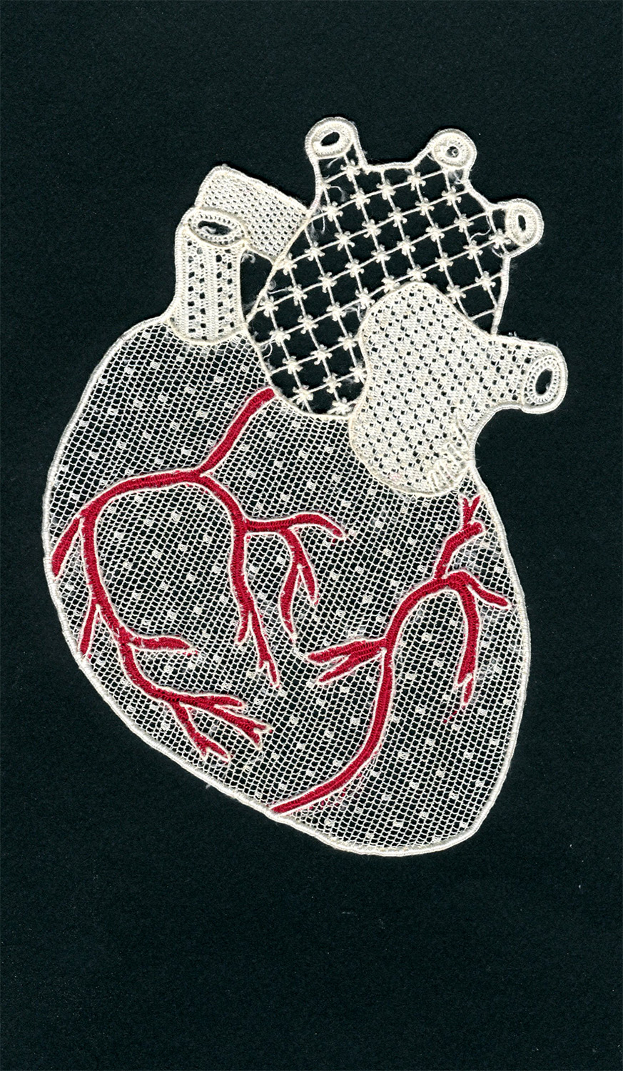 Partendo da alcune suggestioni che richiamano alla memoria la Scuola Medica Salernitana e gli studi iniziali di Filiberto Menna (laureato appunto in Medicina), l’artista disegna un viaggio intimo nel corpo umano, aperto e riprodotto mediante la tecnica del merletto. Corazón, opera che apre l’esposizione, è la riproduzione di un cuore (che rispecchia le misure anatomiche dell’artista) realizzato in filo bianco di cotone e filo rosso di seta con la tecnica originale del merletto di Burano.