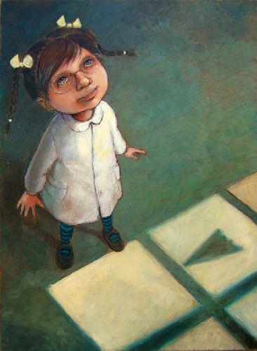 I lavori proposti da Enrica Pizzicori sono invece opere che partono dal racconto, dalla parola, dalla fiaba. Sebbene quadri e illustrazioni siano cose diverse in quanto l’illustrazione è necessariamente subordinata ad un testo, anche i quadri della Pizzicori nascono sempre dall’eco di un racconto, dalla contaminazione con la ‘narrazione’ ed in essi l’artista cerca di infondere quella stessa magia dei libri per l’infanzia. Nell’ambito di questa mostra troviamo quindi opere ispirate, ad esempio, a fiabe classiche come Alice nel paese delle meraviglie o Pinocchio, altre a storie di fate più o meno note ed altre ancora tratte da progetti editoriali illustrati dall’artista, come Il carillon dei desideri ed Il piccolo angelo.