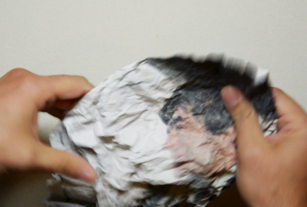 accartocciata, dispiegata, stesa con le mani e poi nuovamente